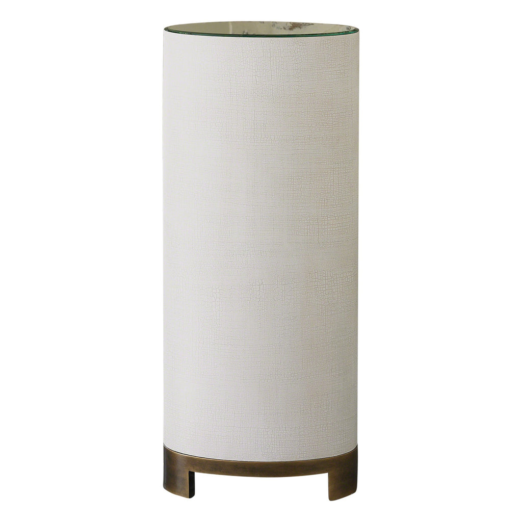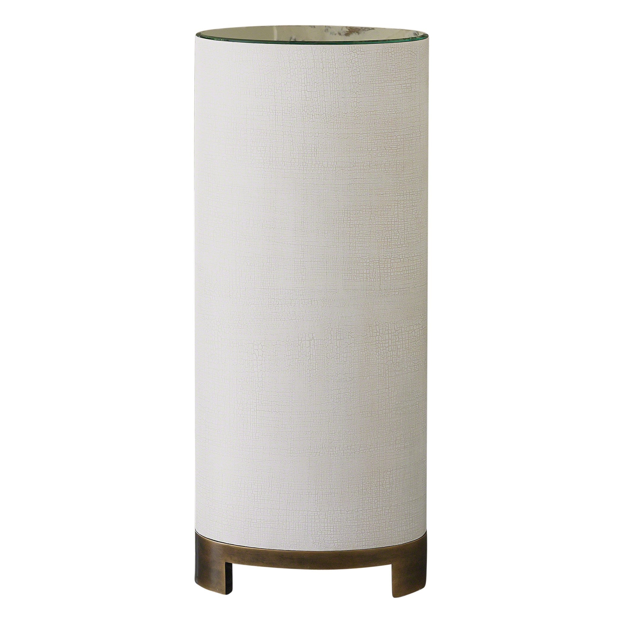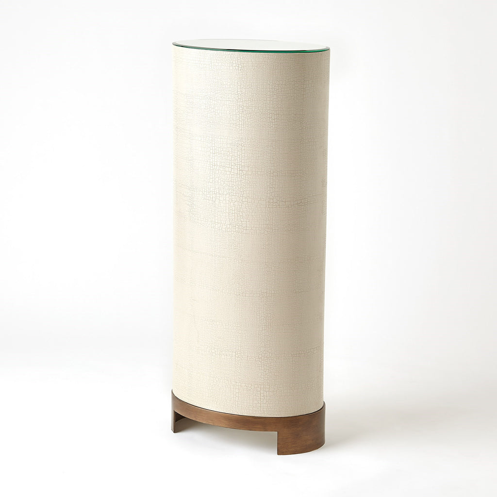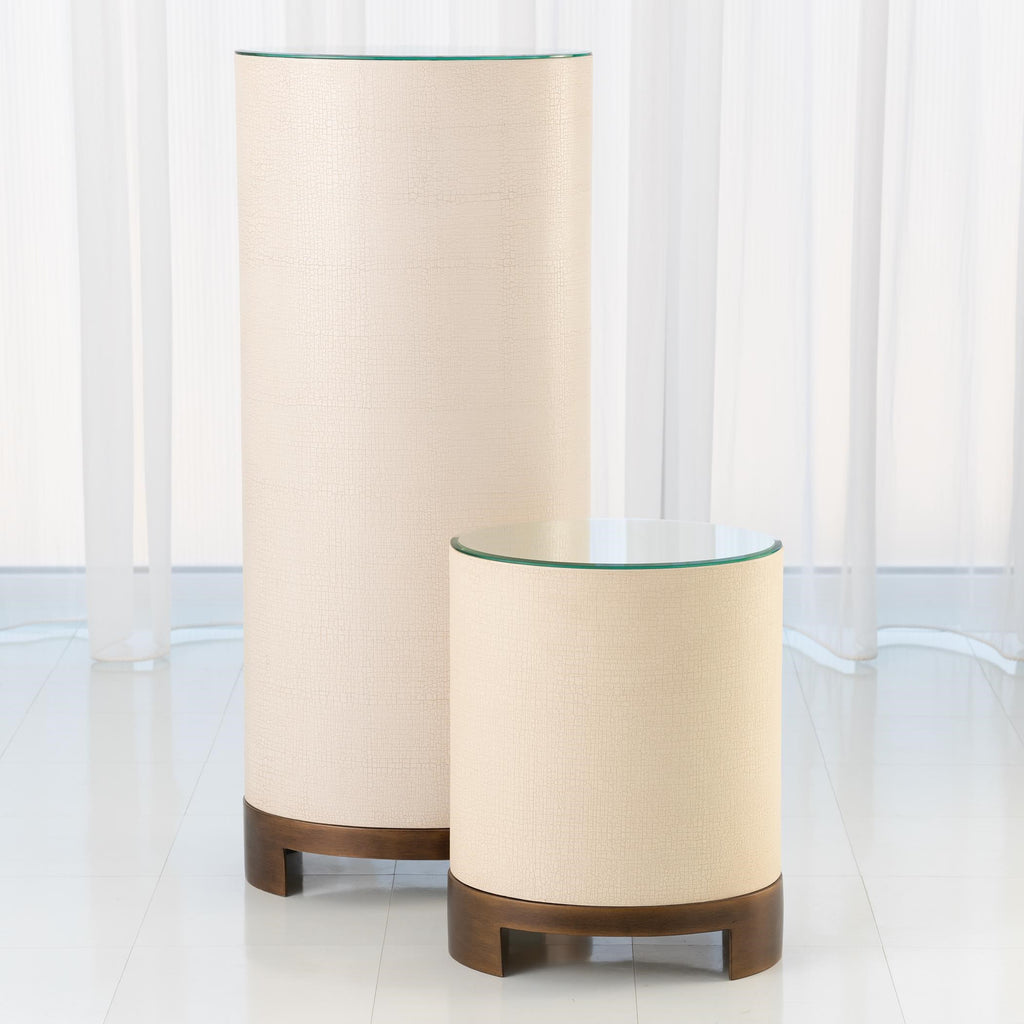The oval shapes of the Ellipse Collection make them a stand-out in any interior. Each piece is first hand-wrapped on all sides in Belgian linen over an acacia veneer. A complex crackle finish is applied on top of the linen to give added dimensionality to the finish. Beveled mirror tops. Interiors are built entirely of American White Oak. Antique brass-finished base and hardware.