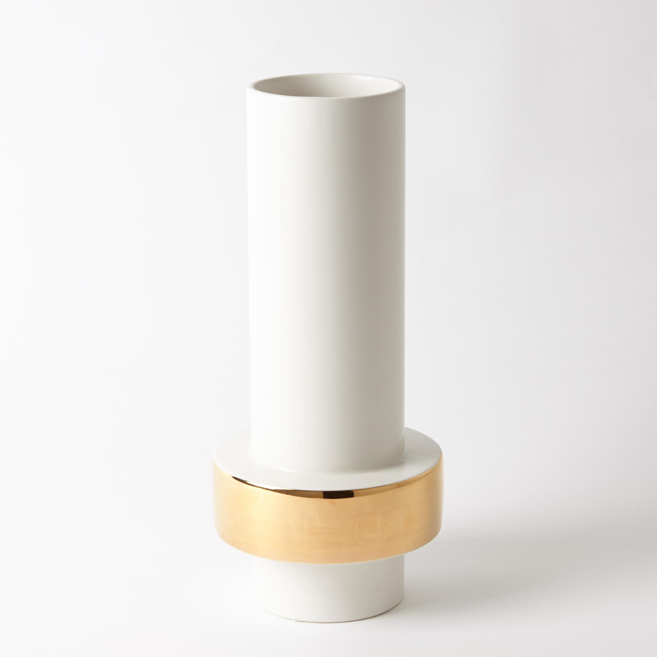 Simple meets luxe with our Gold Ring vases. Beautiful creamy white Portuguese ceramic cylindrical vases get a glam makeover with strategically placed metallic gold electroplated ring collars. Quite remarkable alone, but even better in a group! We have placed the "rings" at different levels so they may fit perfectly together, creating a stunning display. Available in three sizes.