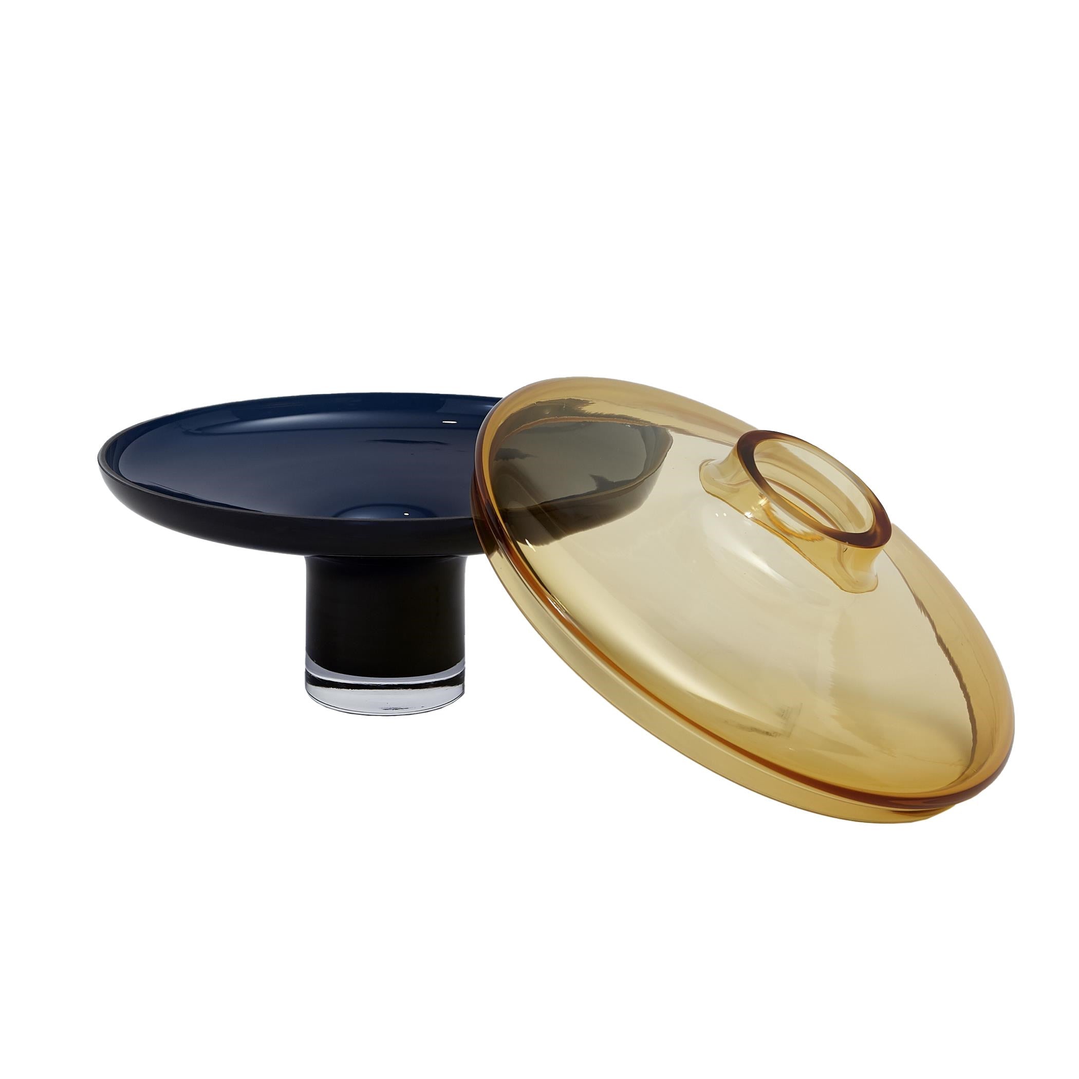 Each of these remarkable art glass pieces is composed of a separate base and lid - one amber and one cobalt. Made in Poland.