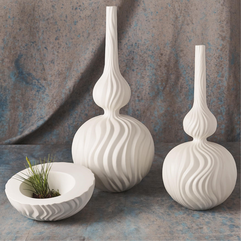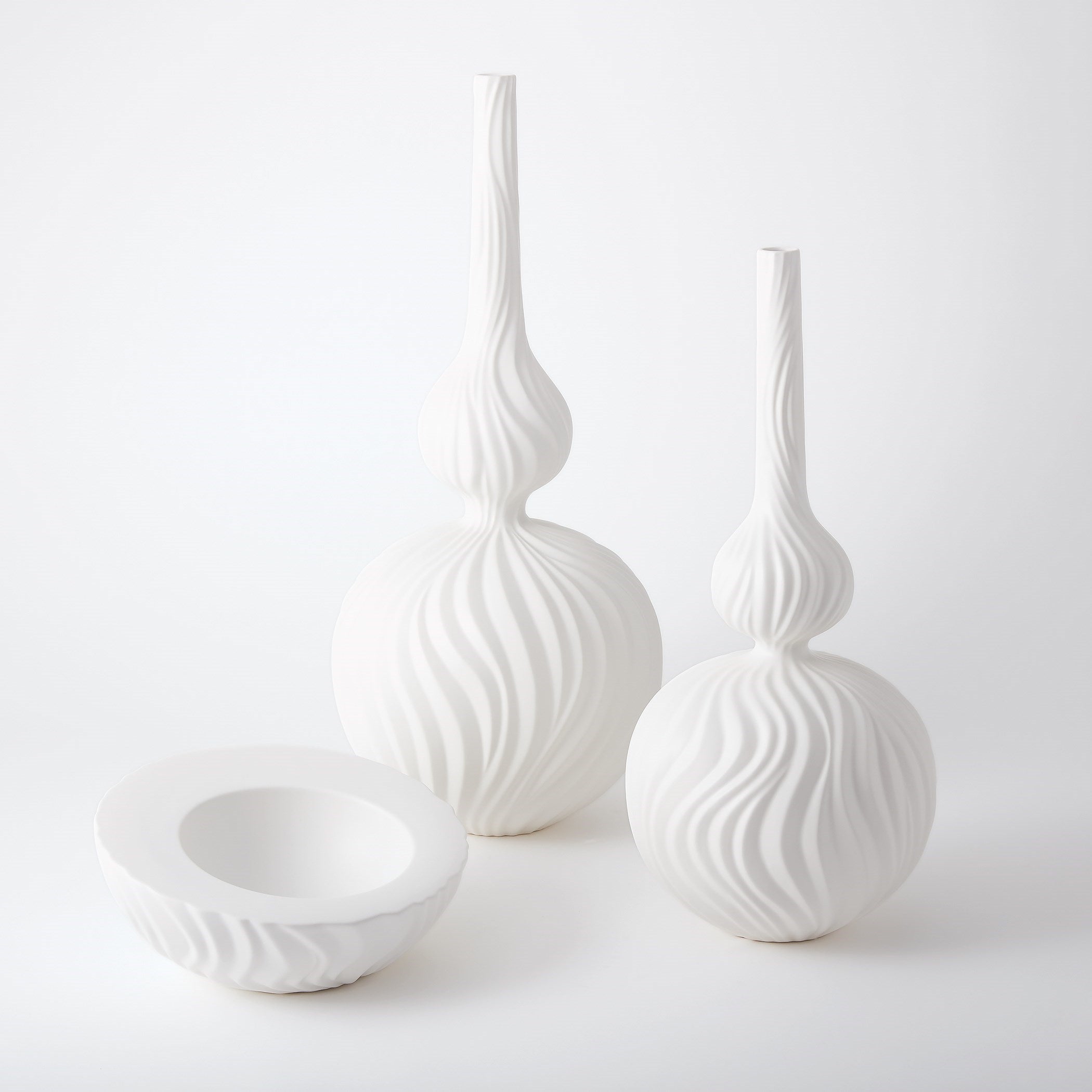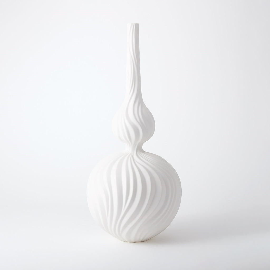 Swirled ridges give texture to this solid colored ceramic piece. Our snow white Magura Vase is a textural wonder that will add to the visual interest of any room.