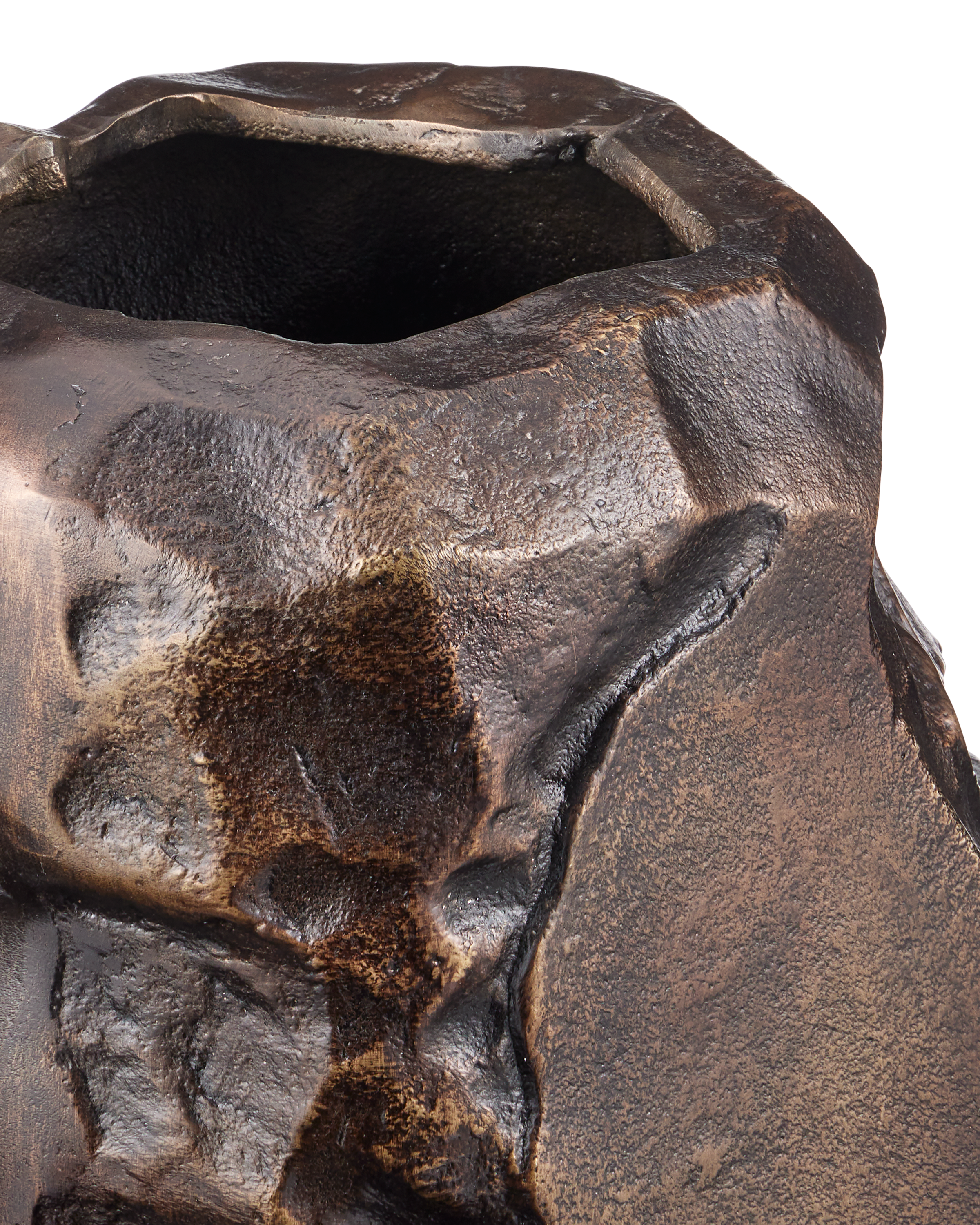 Brutalist in style, the Carmelo Vase Set includes two cast aluminum vessels in a scorched bronze finish that brings the surfaces a warm gleam. The organically shaped profiles look as if they were born during the famous time in design history when brutalism was at its height. Made in two parts and joined with a welding process, these vases are designed for use only with artificial flowers.