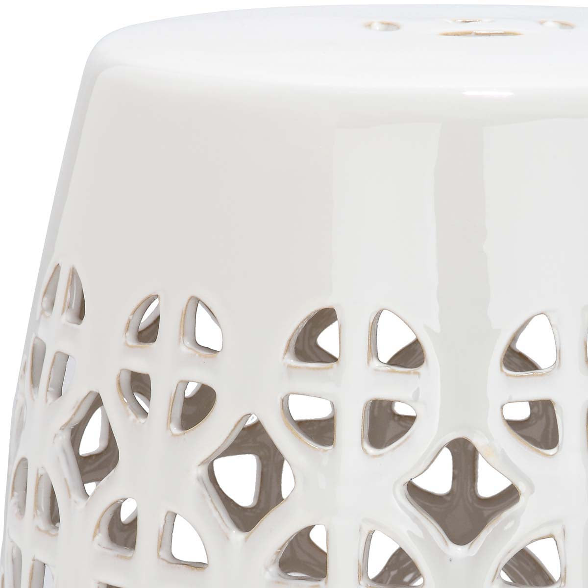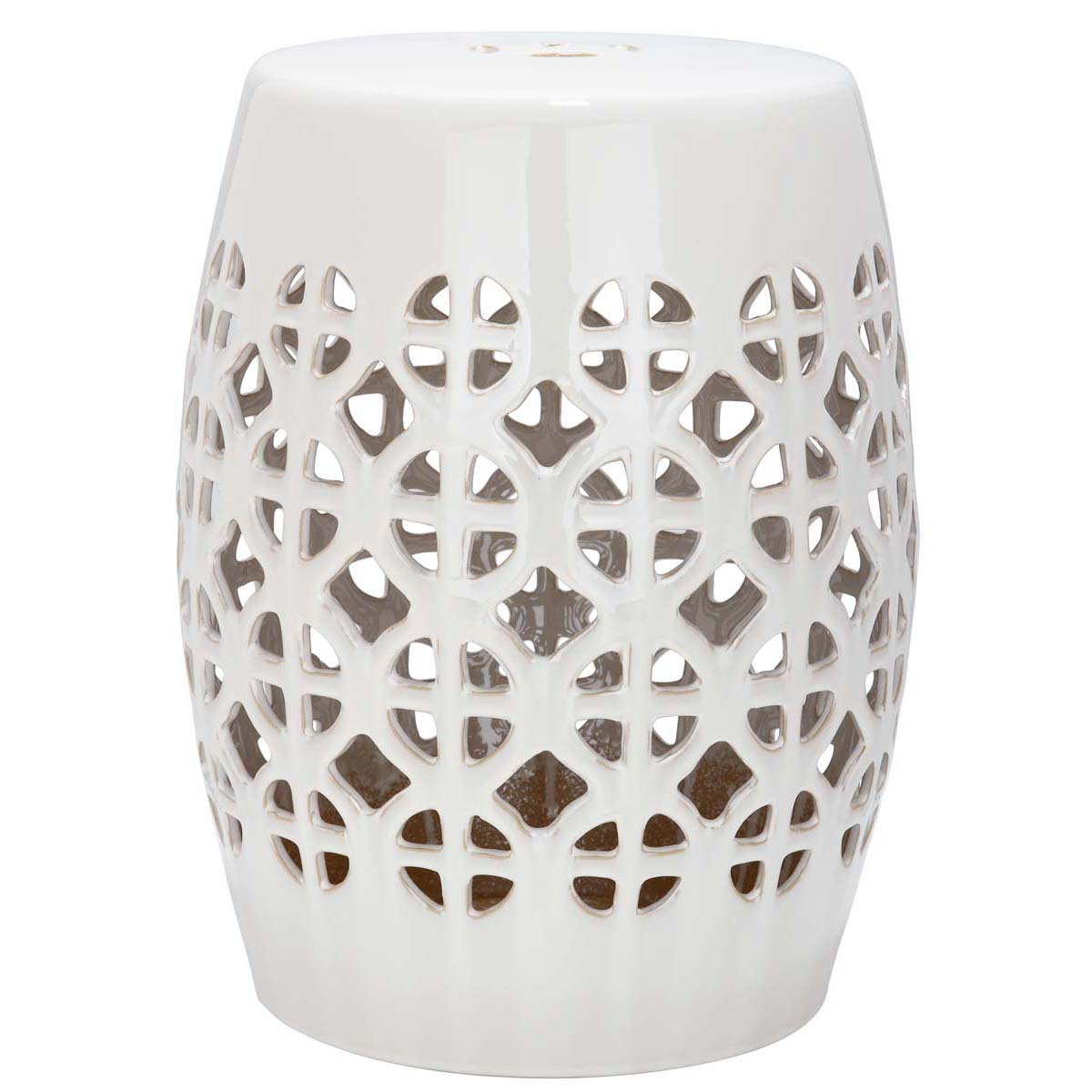 It?? simple geometry: this transitional garden stool's circle and square lattice brings a chic new look to an ages old cultural classic. Use this striking accent piece indoors or out; its glazed cream ceramic stands up to the elements.