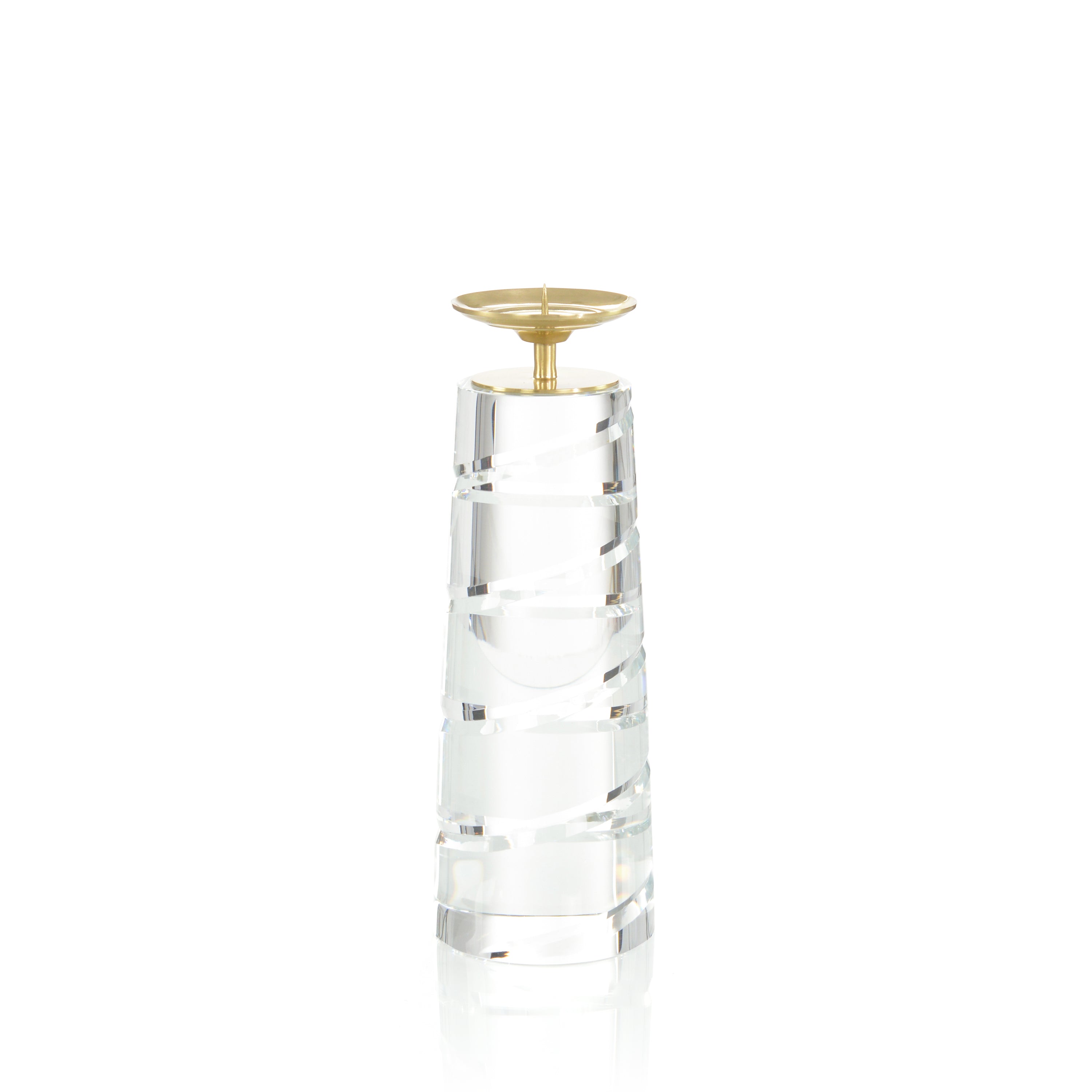 A stunning pillar of clear crystal, this elegant candle holder features a tall, tapered profile adorned with a wax catcher finished in Polished Brass. The interplay between metallic brass and clear crystal creates a modern, sophisticated look that is greatly enhanced by a series of ringed patterns resulting in beautiful spirals that span the length of the body. This stunning accent piece greatly elevates a space by itself, but can also be placed alongside its larger twin to further enhance the look.