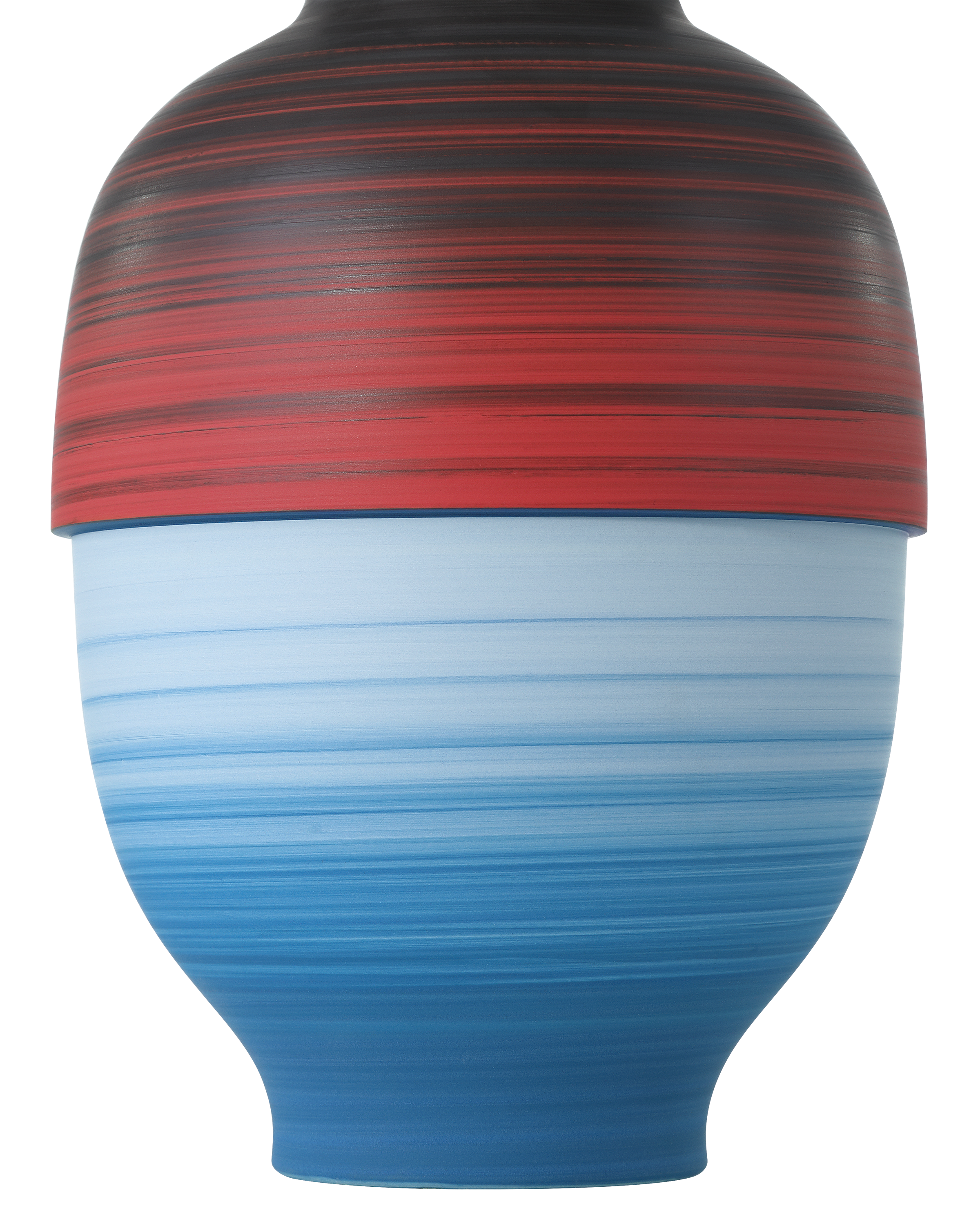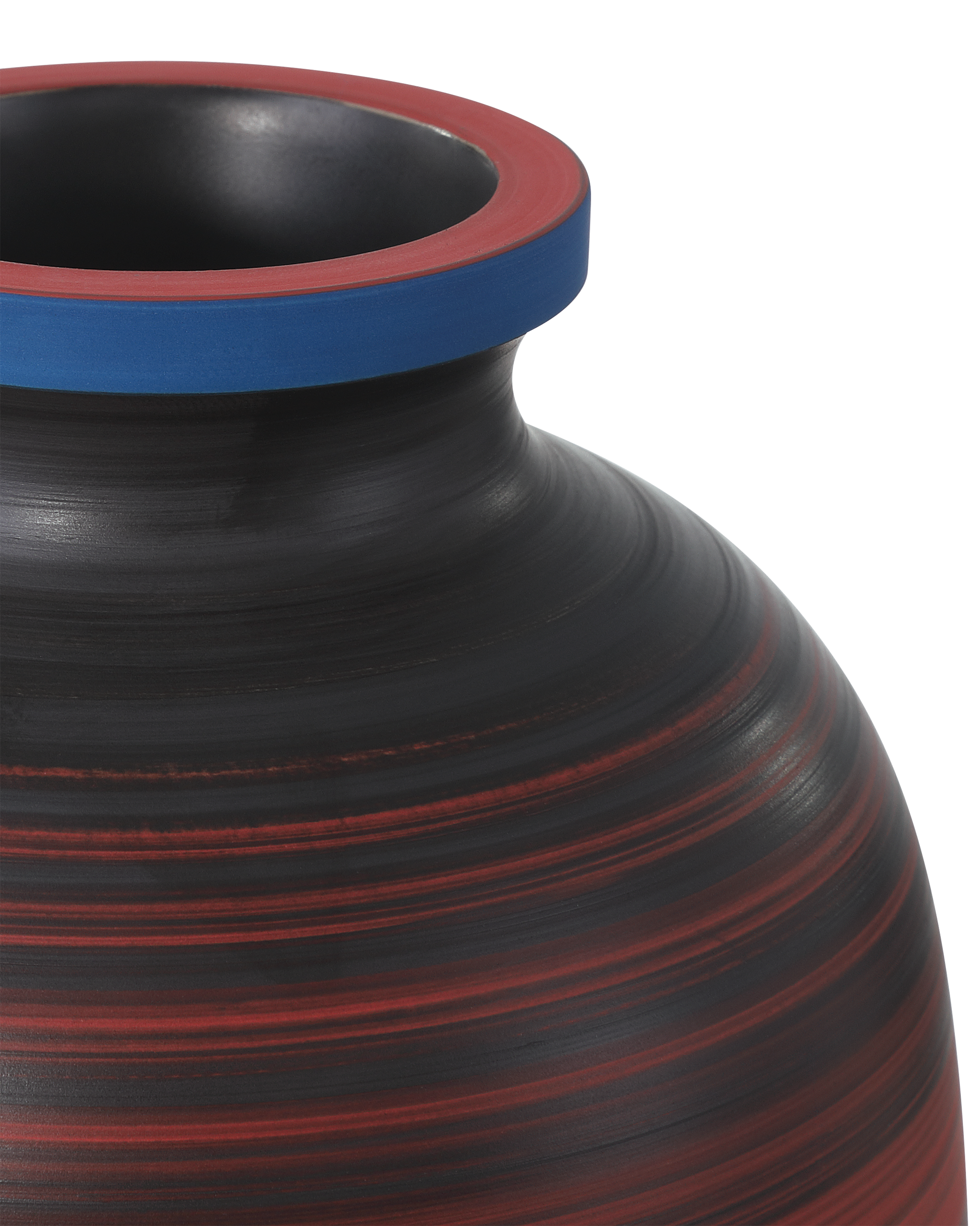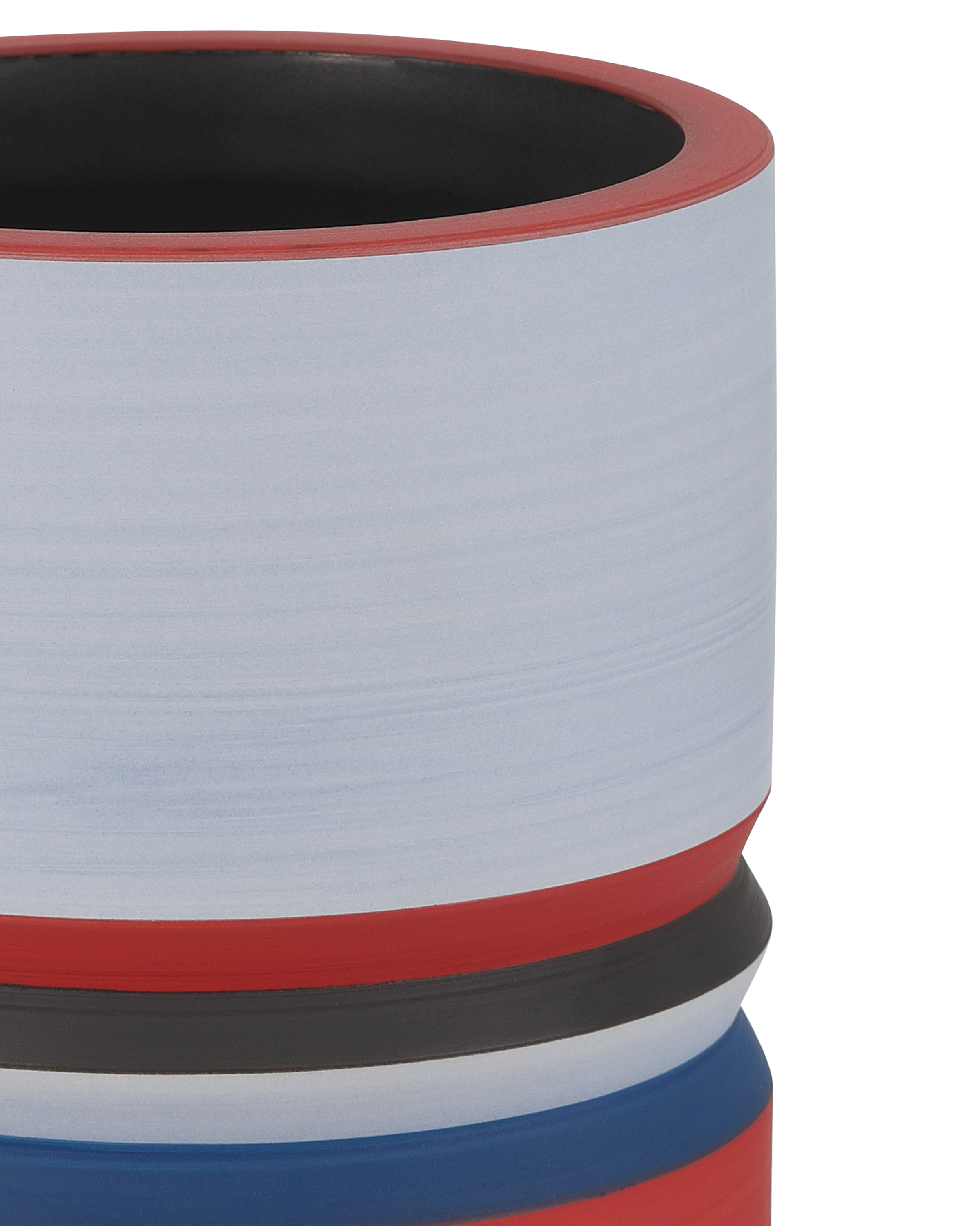 The Happy 80’s Black, Blue, Red & Orange Vase Set is a throwback to the decade when bold, vibrant, and eclectic ruled the stylistic spectrum—from interior design to fashion. Made of porcelain, the glazes on the exteriors of these vessels will vary because they are applied while the vases are spinning. This brings the two works of art a textural feel. The insides of the vases are covered in a black glaze, and the shapes of the vases reflect the nuances of the decade after which they are named.