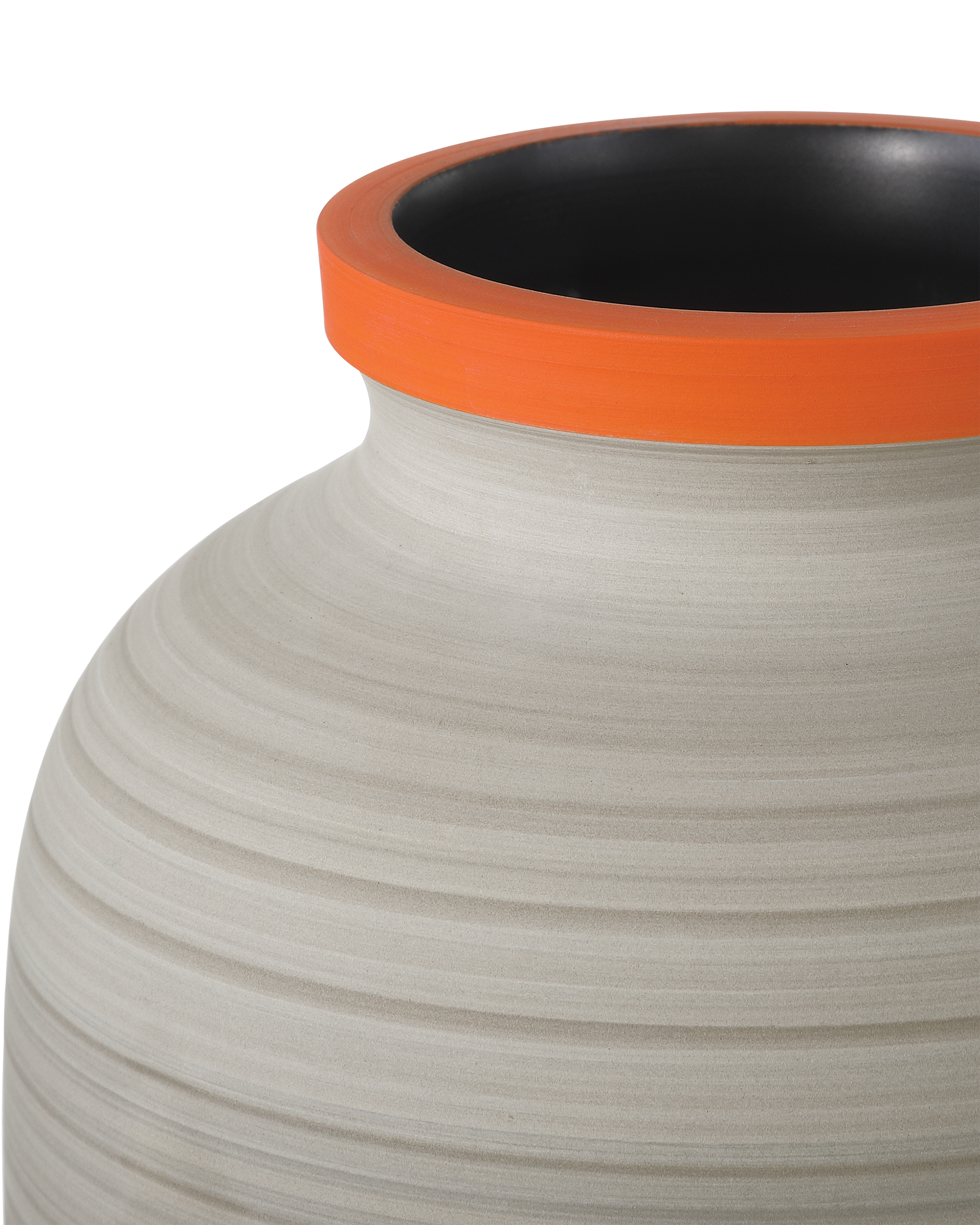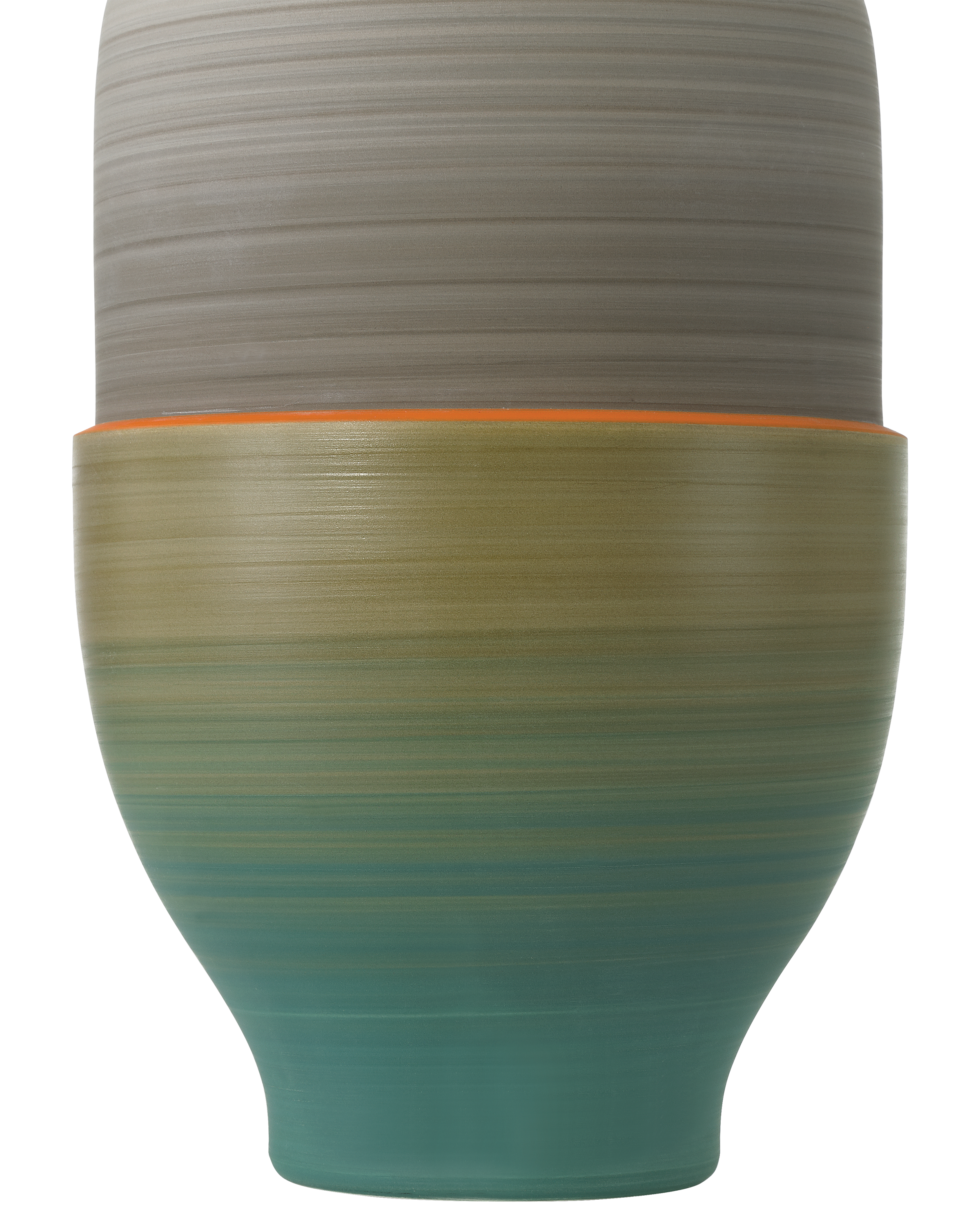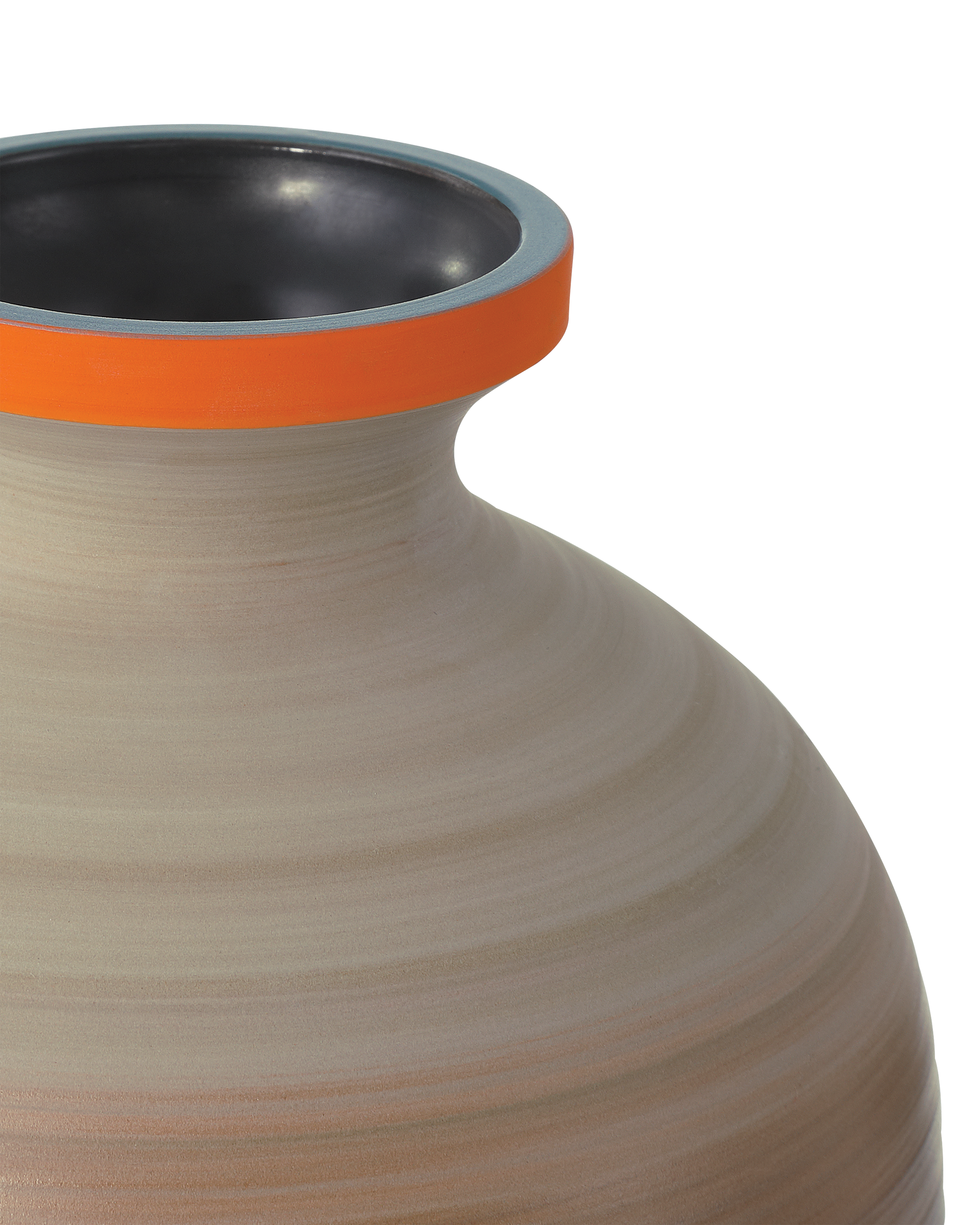 The Happy 80’s Gray, Beige, Orange & Blue Vase Set is a throwback to the decade when bold, vibrant, and eclectic ruled the stylistic spectrum—from interior design to fashion. Made of porcelain, the glazes on the exteriors of these vessels will vary because they are applied while the vases are spinning. This brings the two works of art a textural feel. The insides of the vases are covered in a black glaze, and the shapes of the vases reflect the nuances of the decade after which they are named.