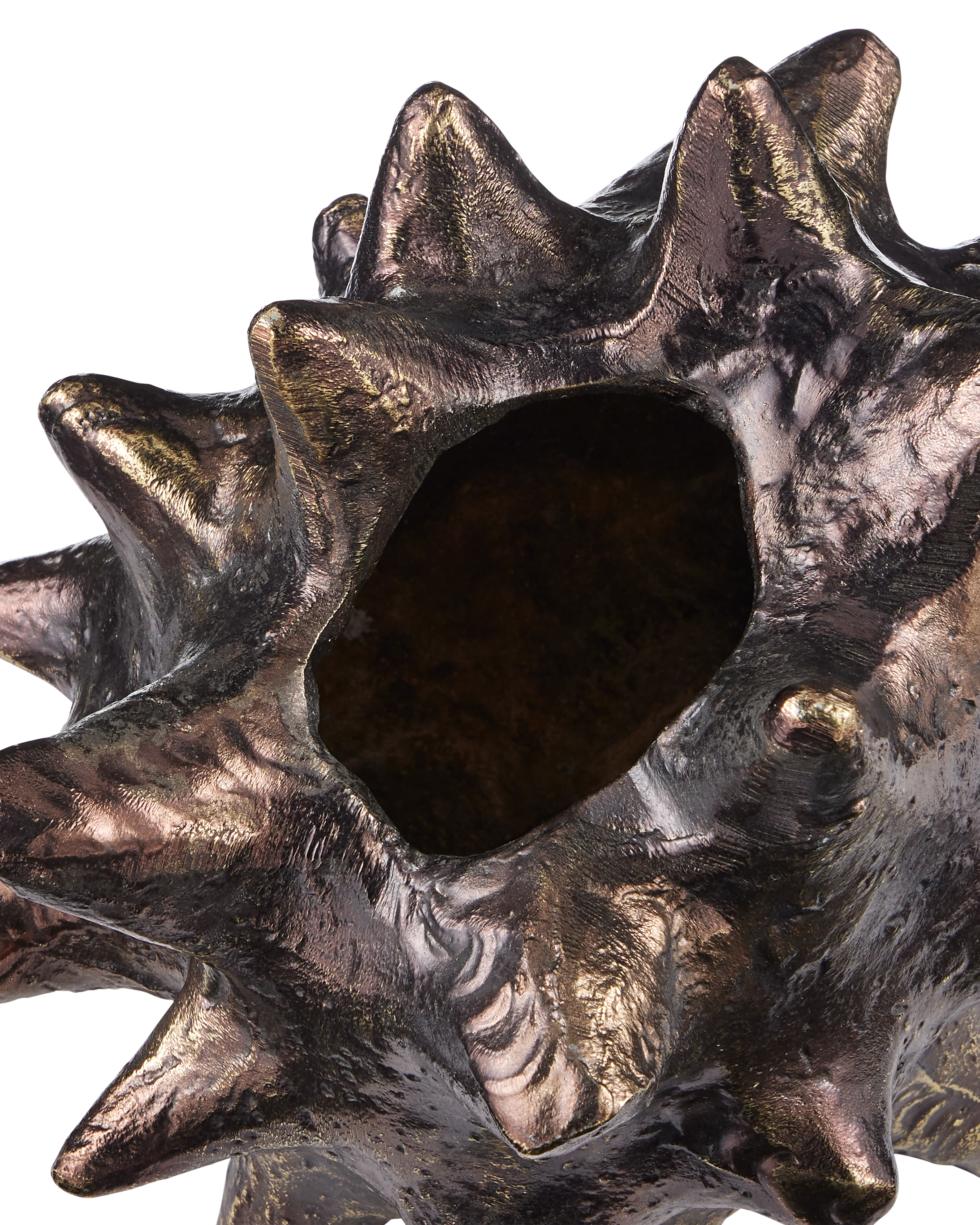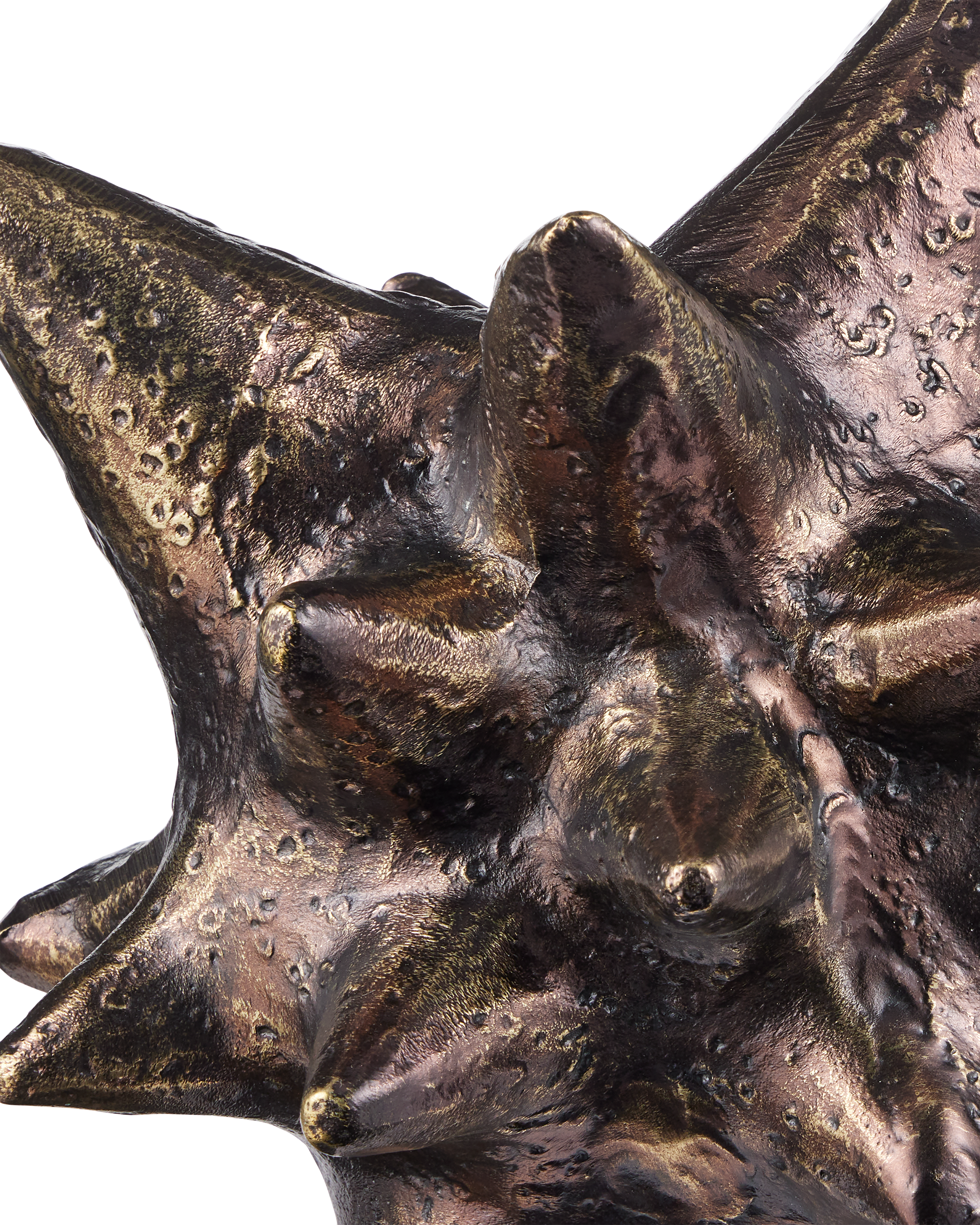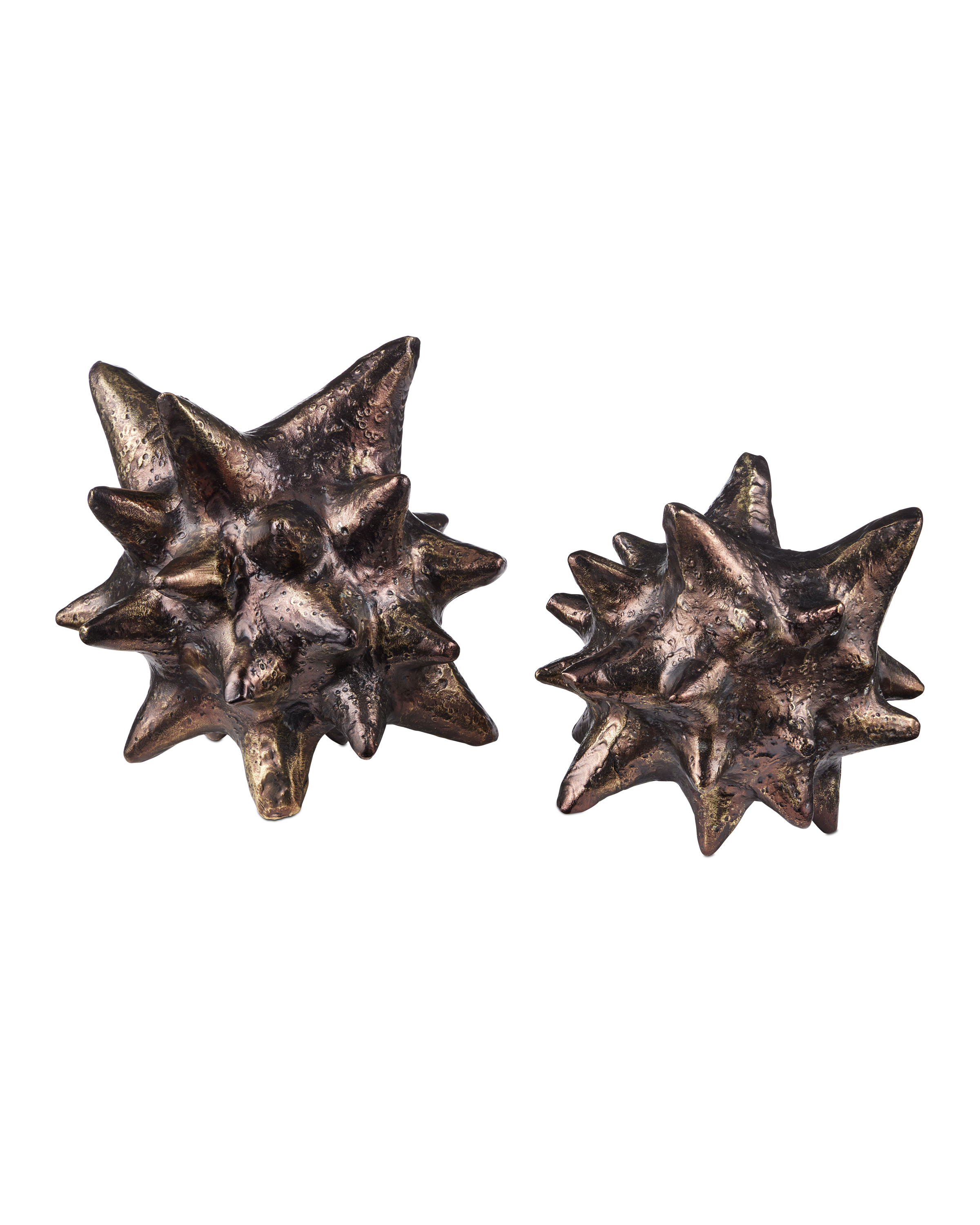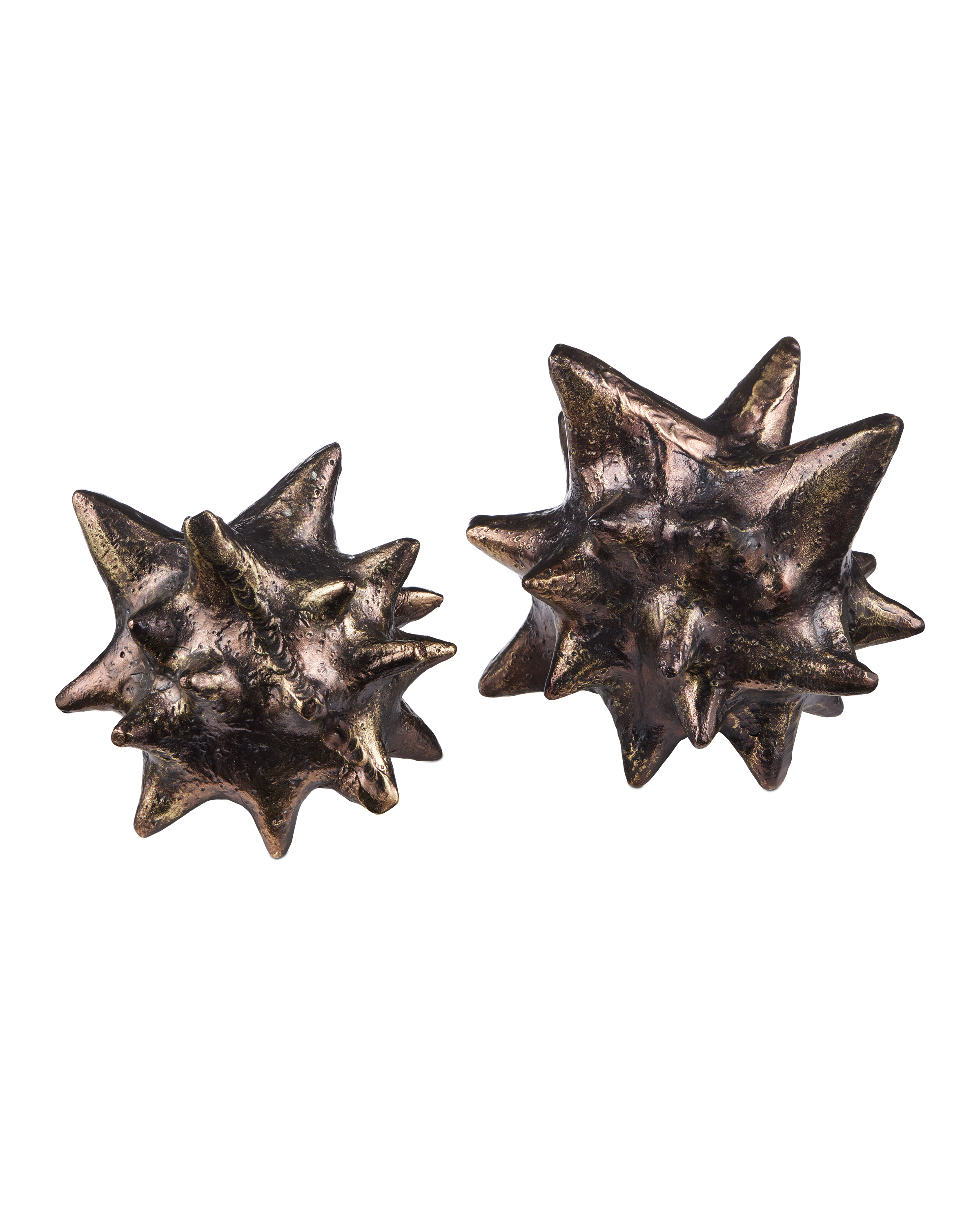 A pair of spiky decorative accessories, the Jacks Object Set includes two cast aluminum sculptures that gleam in an antique brass finish. Once the pieces are pulled from the mold, artisans treat them to the mottled finish that makes them looked aged.