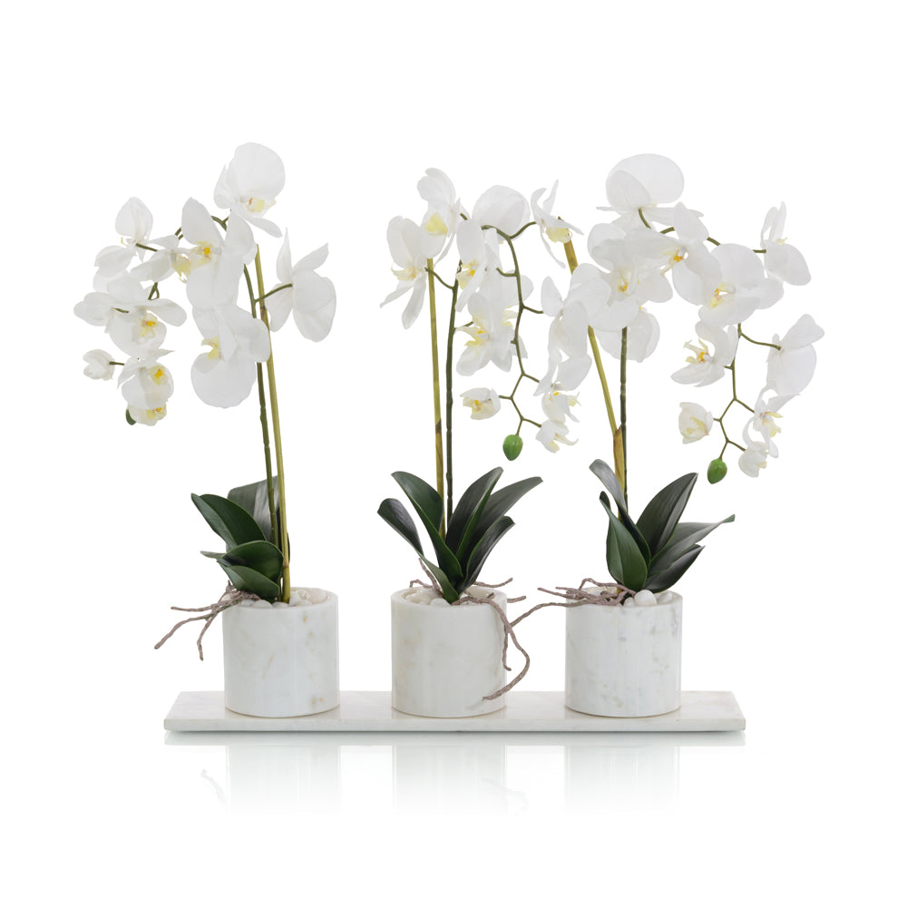 Phalaenopsis orchids, rolled marble stones, and faux water are in round marble vases atop a marble base.