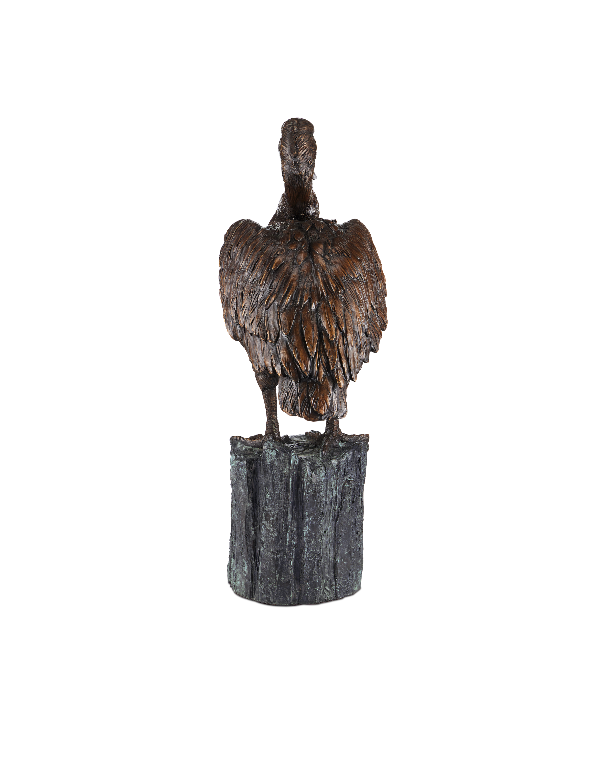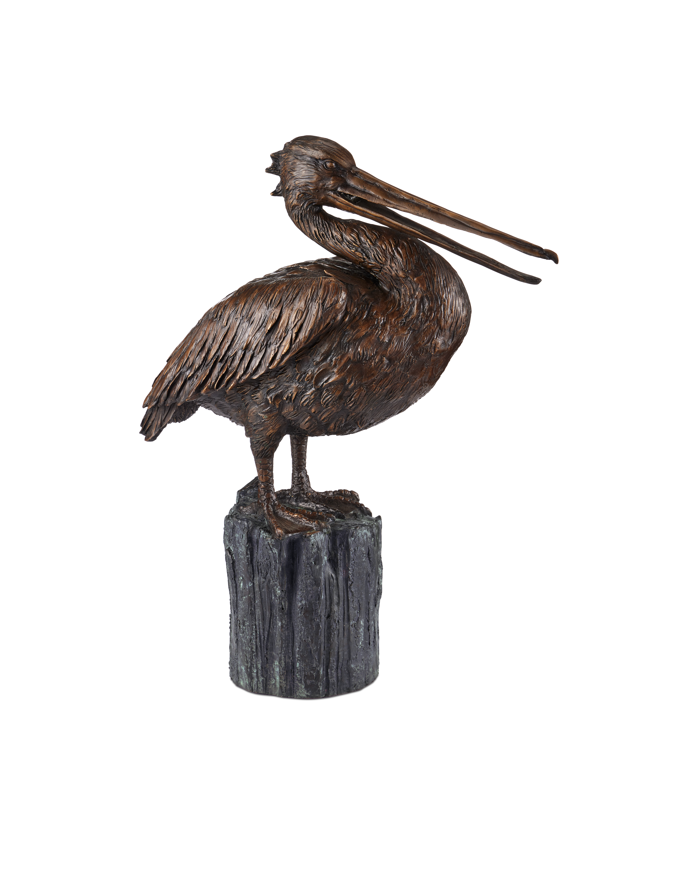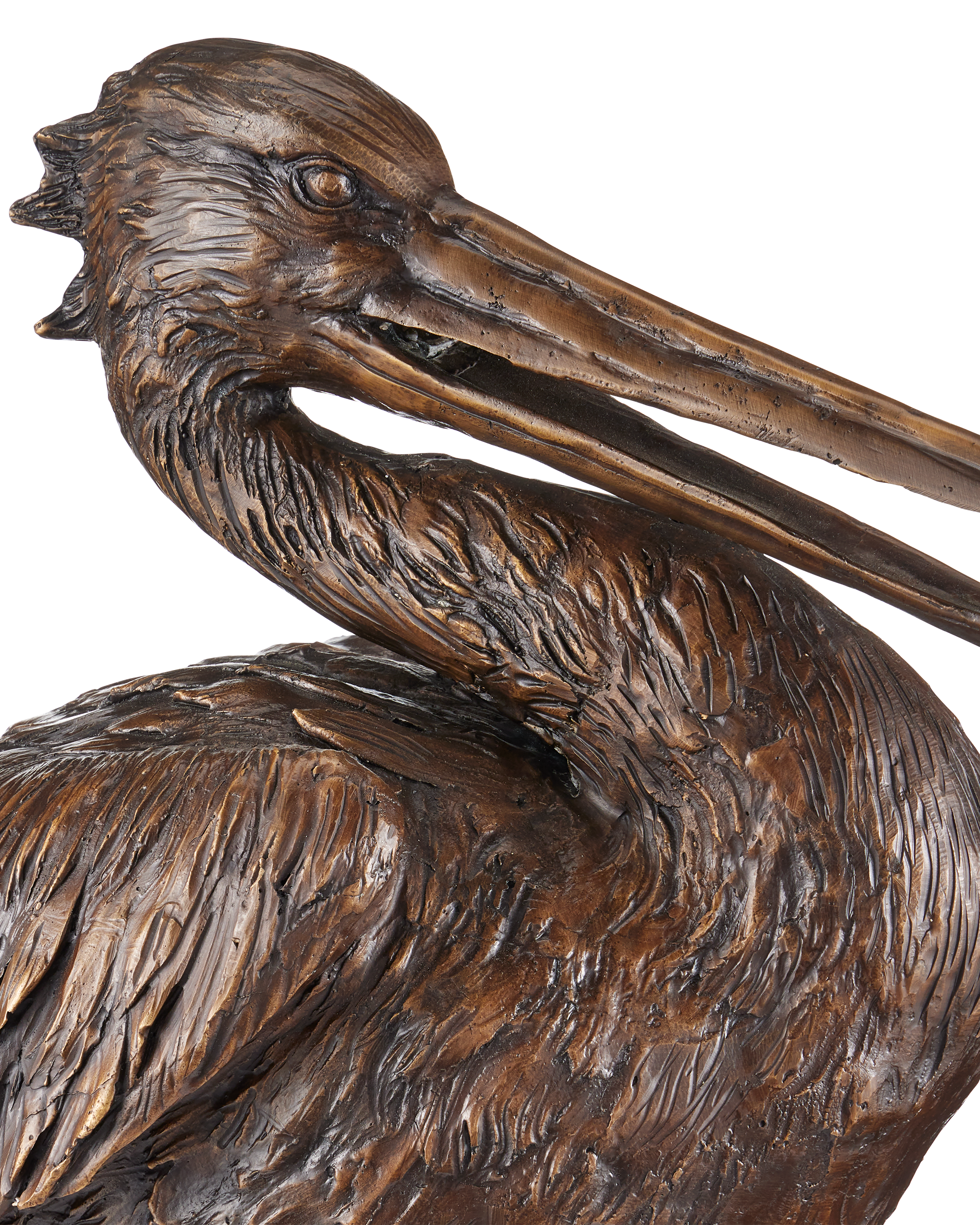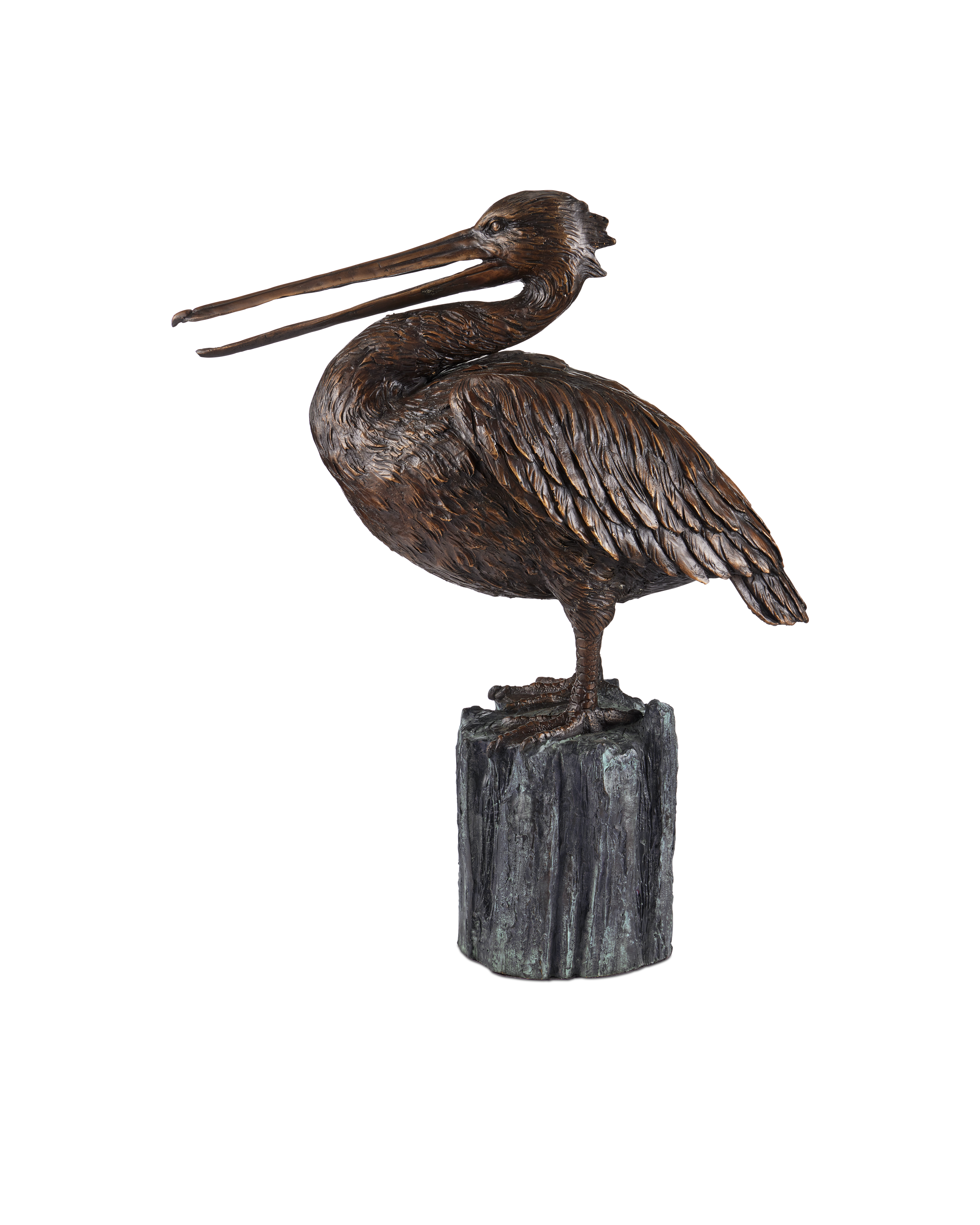The Pelican Bronze sculpture is a remarkable piece of art. Finished in black bronze, this piece comes to life through a multi-step lost-wax casting process. After casting, the artist adds thoughtful touches like polishing or additional finishes to complete the look, illustrated here by the shine of the pelican itself juxtaposed against the matte finish of its perch.