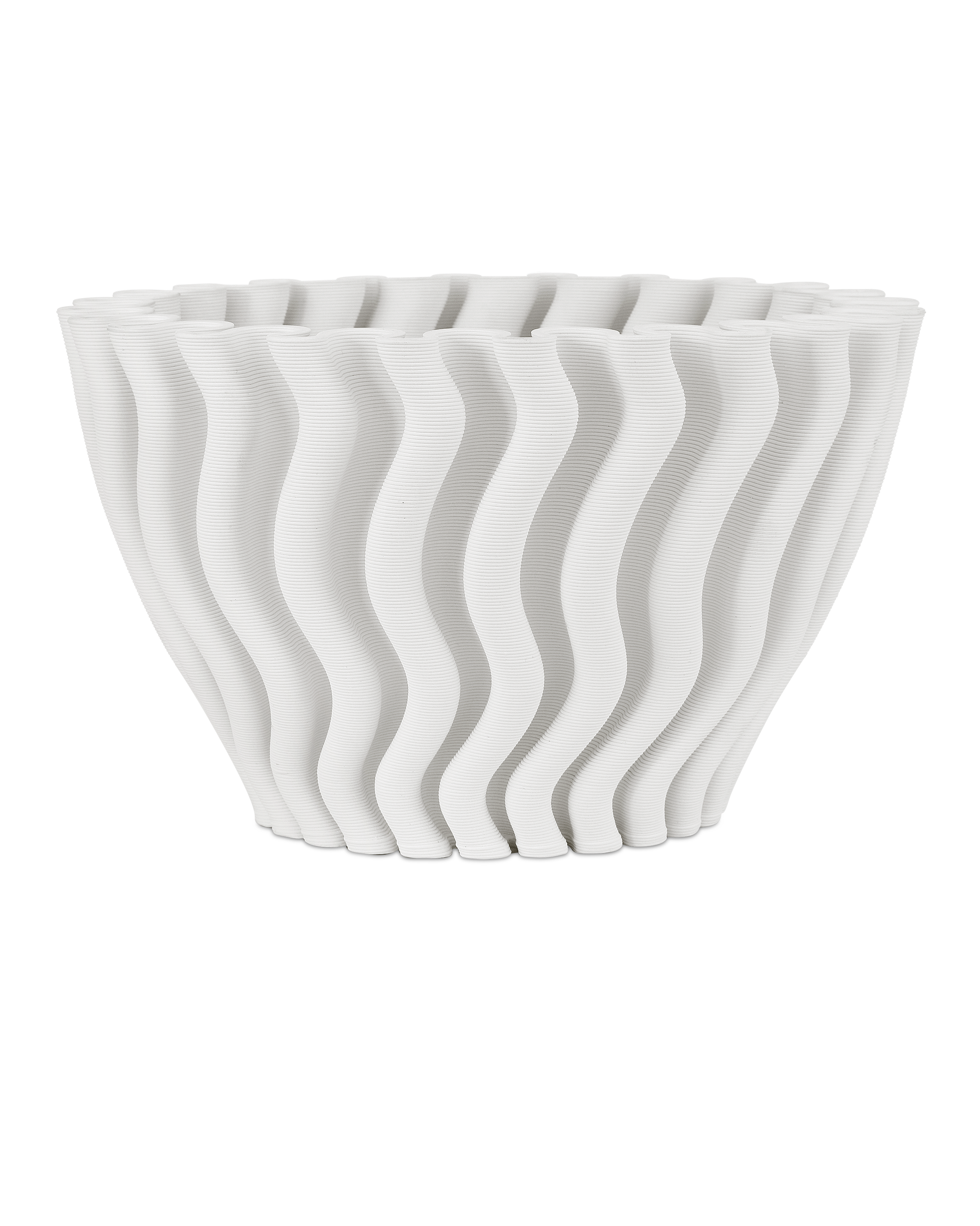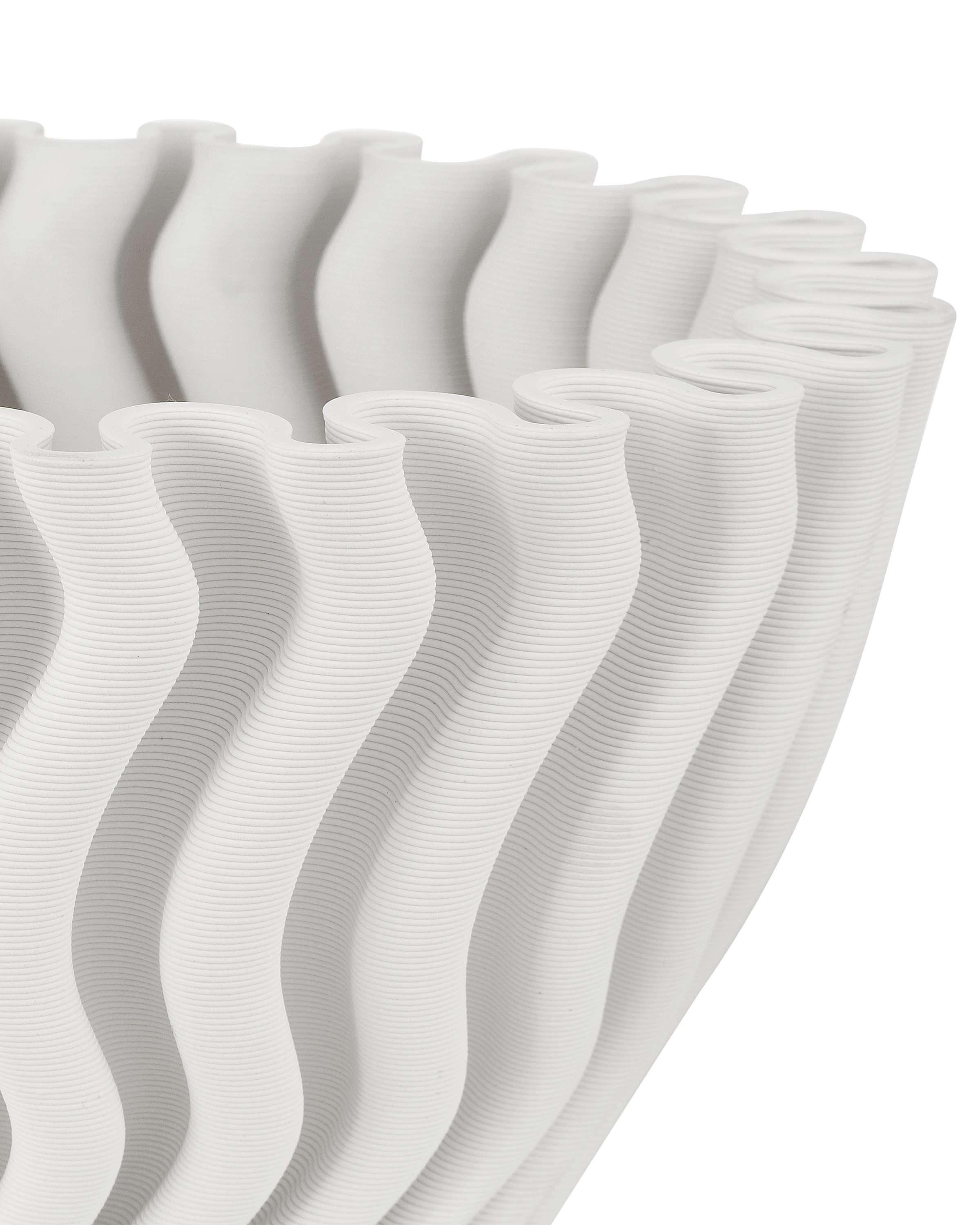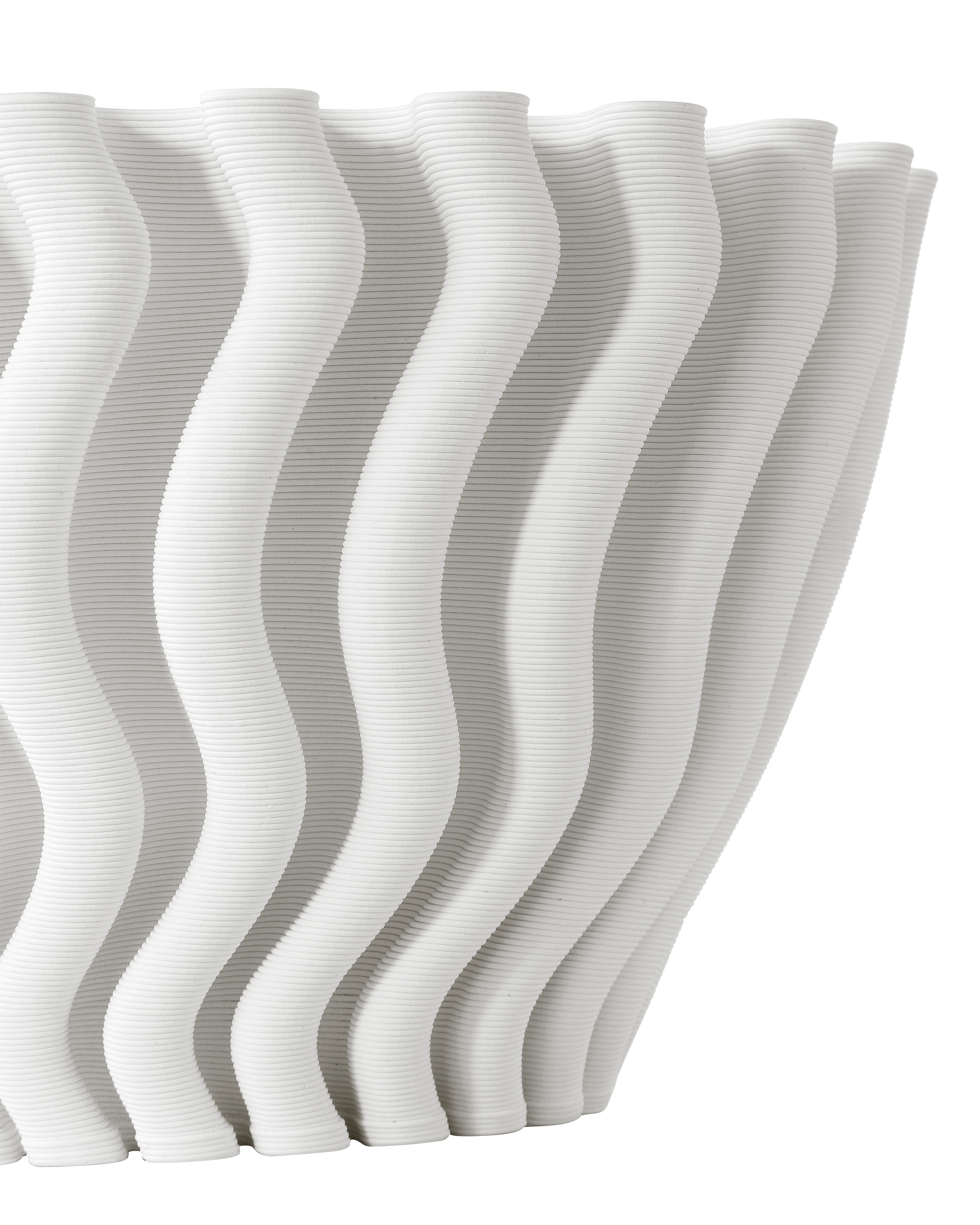 The Ripple White Vase is a technological feat. The deep furrows that wrinkle around the form to create waves of movement are achieved with such a uniformity they can only be machine-made. The most surprising thing about this handsome vessel is that it is made of 3D-printed porcelain, an ancient material you might not expect to be so amenable to such modern process.