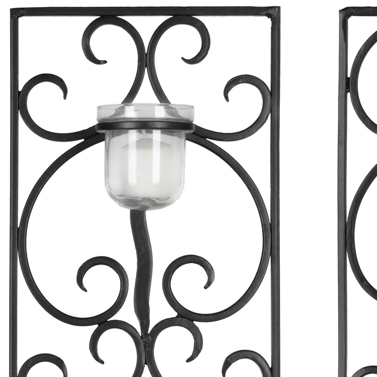Three rectangular panels, with six glass votive candles holders, make a dramatic statement. This classic scrollwork patterned wall sconce is crafted from iron, with a sophisticated black finish.