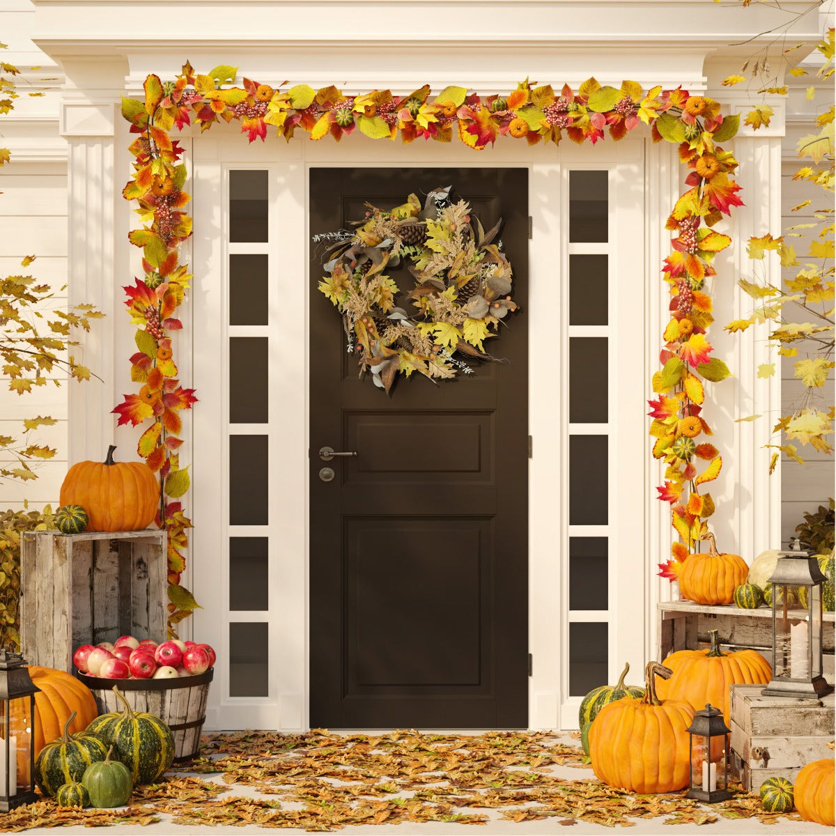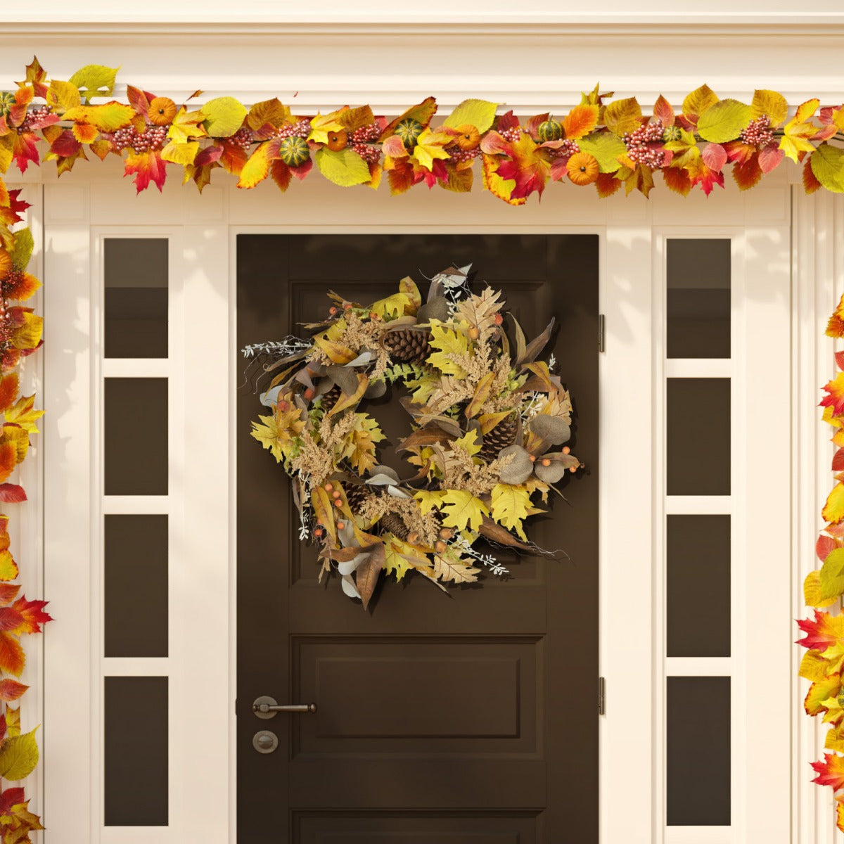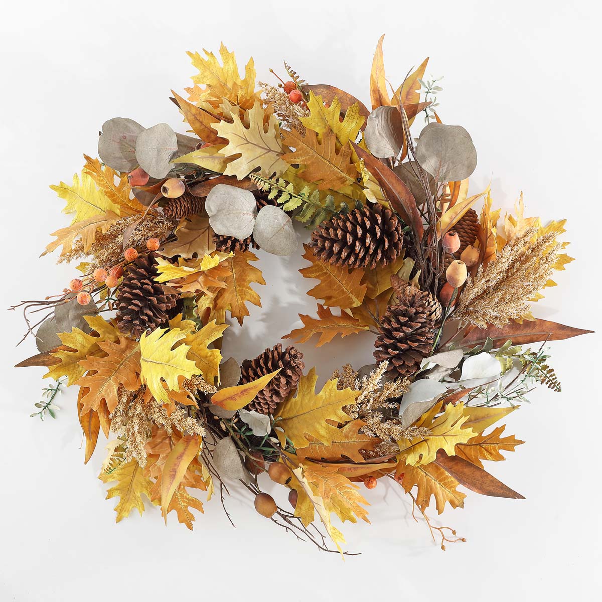 Give a warm and hearty autumnal touch to your home with our faux oak and eucalyptus wreath. With colors ranging from soft greens to burnt orange and dusty yellows, our fall wreath elegantly shows off the colors and textures of the season. It features lifelike detailing to bring a vibrant, organic feel to your home. Perfect for a quick and simple autumn refresh, our faux wreath can grace your door, fireplace, or dining area.