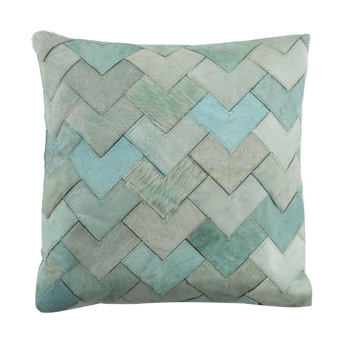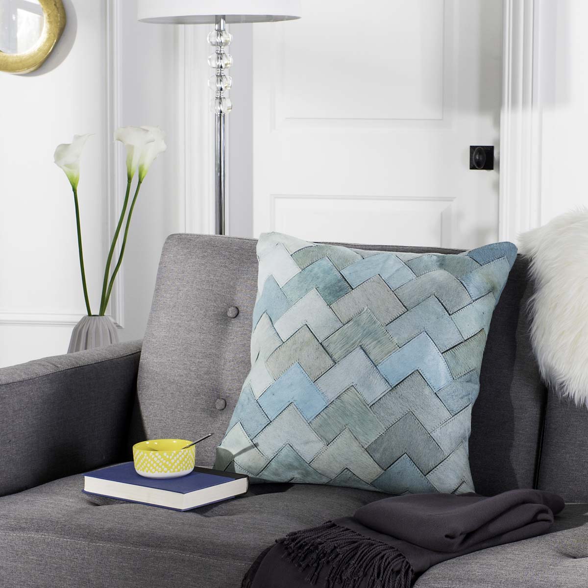 A look of voguish indulgence comes to bold and classy home decor in the Draper Cowhide Pillow by Safavieh. Soft squares of cowhide dyed in vibrant teal tones display a comforting, natural textures, making this accent pillow a warm addition to any trend smart living area. Draper?? flowing pattern of scale like chevron motifs perfectly harmonize with the gradient of blue hues for a distinctive accessory that plays marvelously well with both rustic glam and boho chic furnishings.