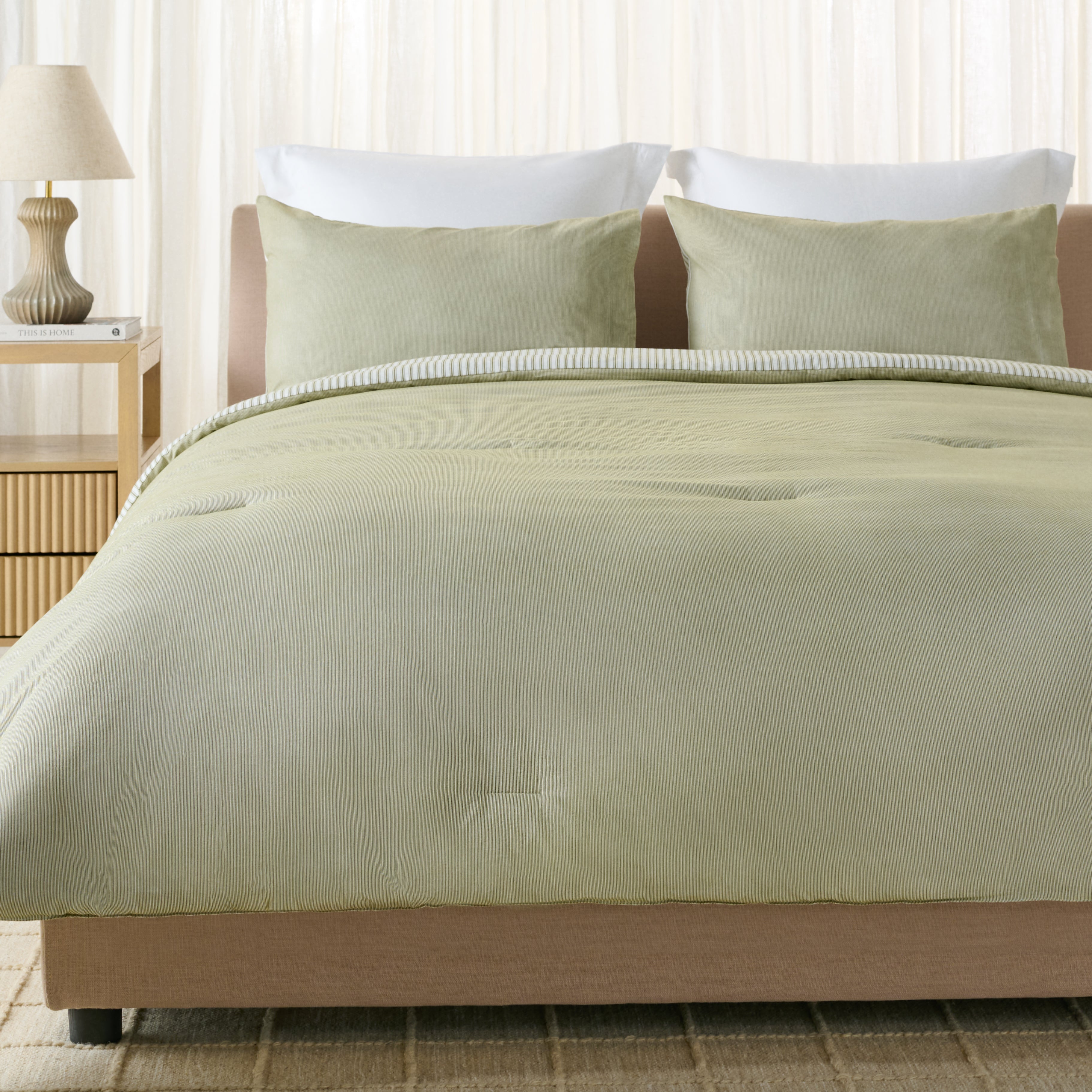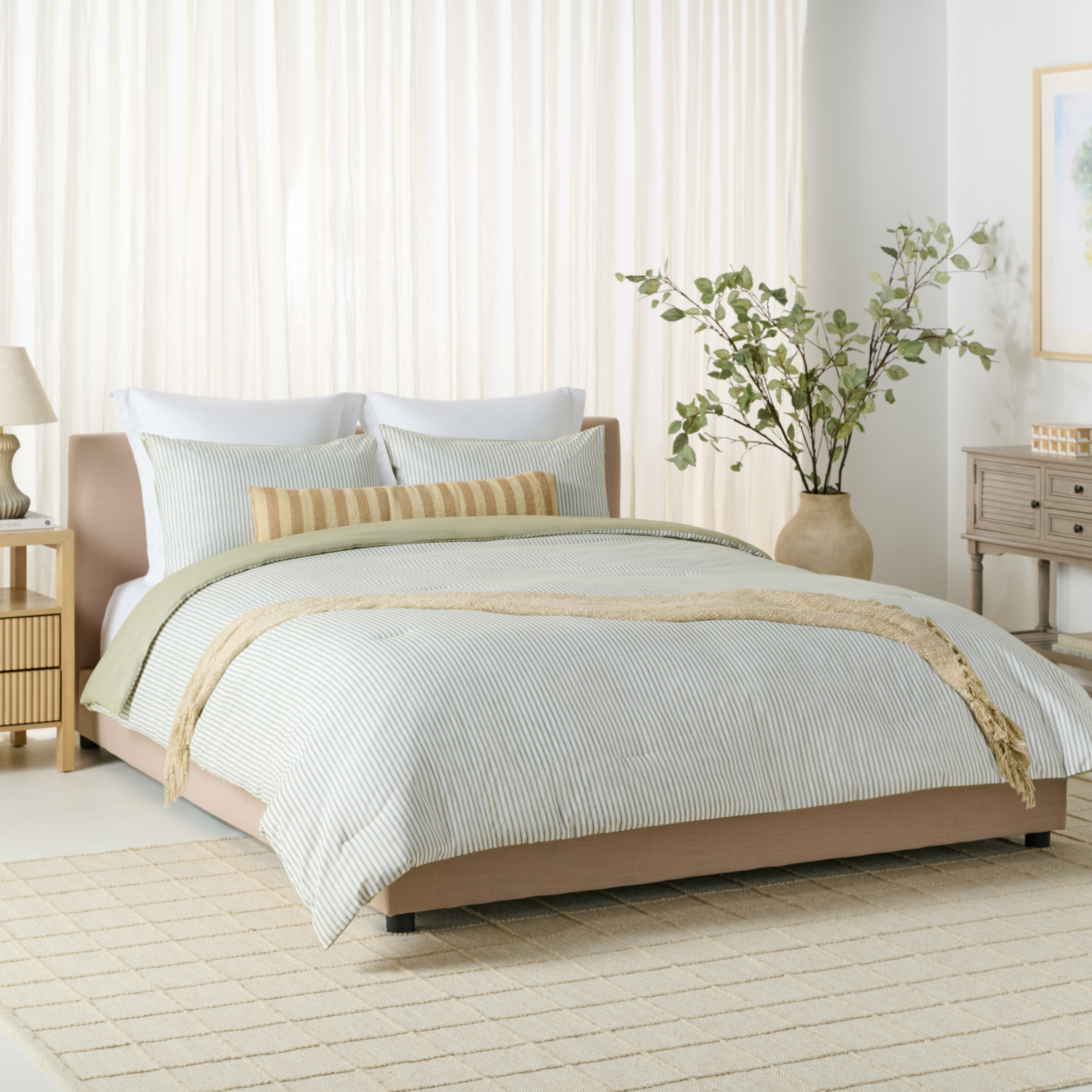 Packaged in a clear PVC bag with rope-style handles, it offers not only practical storage but also an elegant presentation. Elevate your sleep with the Stripe Reversible Comforter Set, where comfort, style, and subtle texture meet seamlessly.
