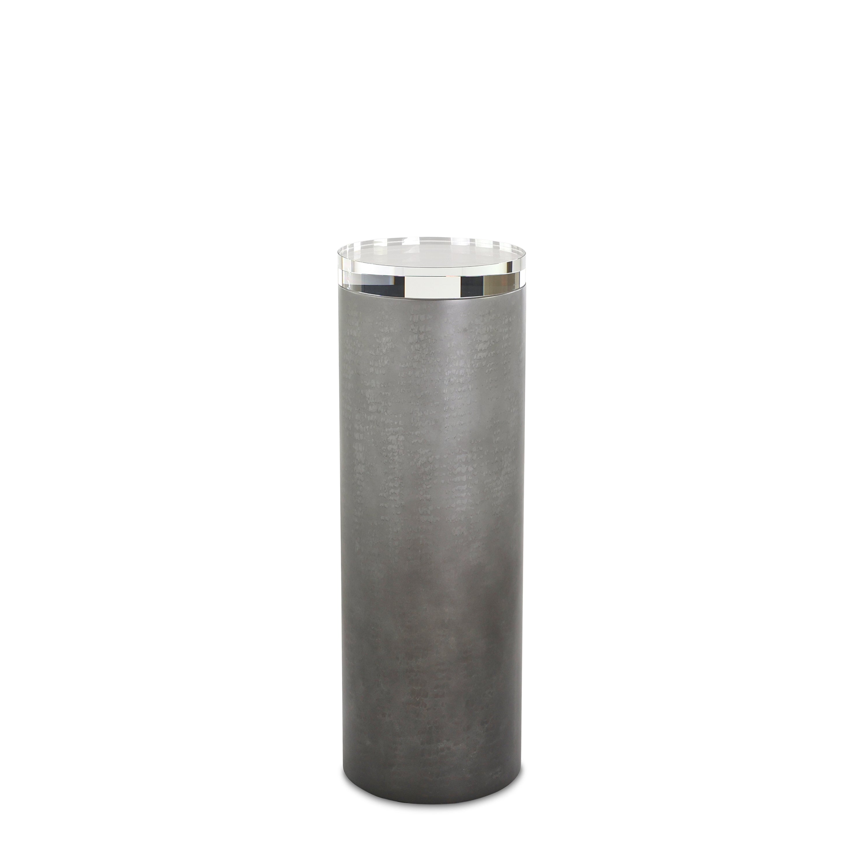 The Serpent Pedestal is a sleek, contemporary piece that depicts naturally occurring patterns in stylish tones. This cylindrical pedestal features an Ombre Silver Snake finish, displaying a beautiful snakeskin motif. A surface of clear crystal rests at the top, complementing the elegant silver tones.