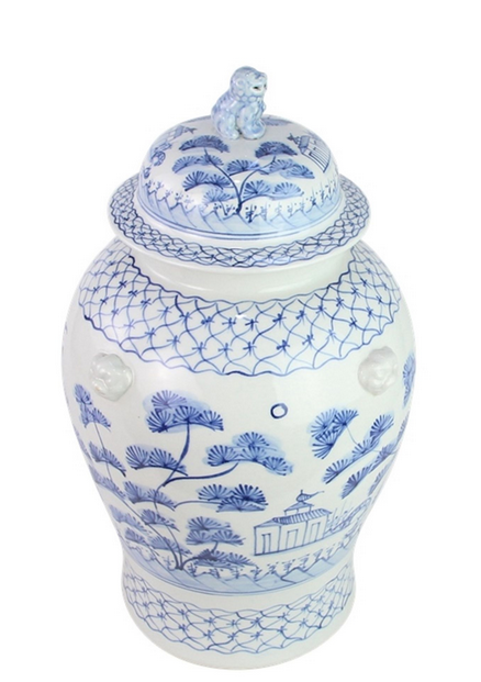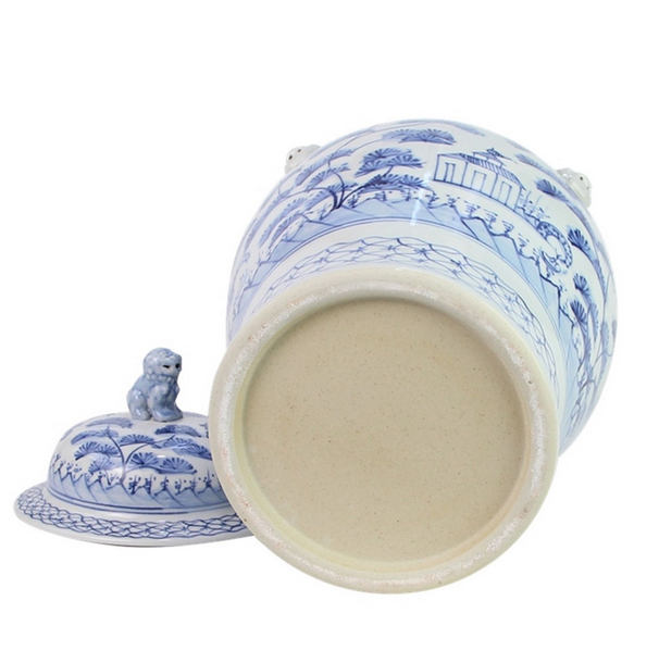 This stunning large ginger jar is a true standout. Hand-painted to complement our delightful village scene tulipiere and garden seat, whether showcased alone or as a pair, this ginger jar is unmatched in beauty. Adorned with a majestic foo dog lid, the entire body of the jar is meticulously hand-painted, making it a masterpiece of craftsmanship and elegance.