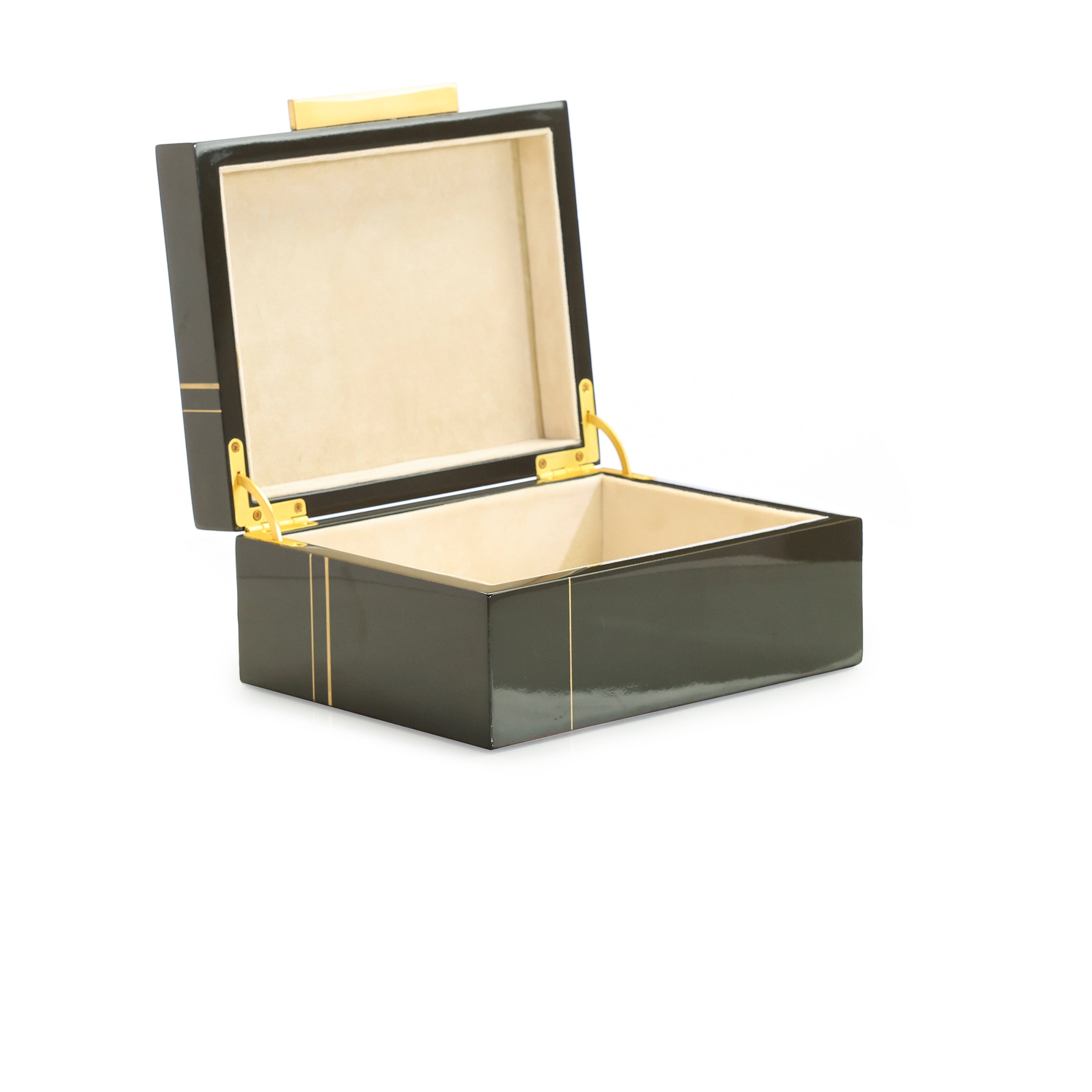 The Tenebra Box is a sleek, contemporary accent piece with an elegant black color elevated through gold detailing. The box is lined with felt and adorned in a taupe finish, beautifully complementing the brushed brass handles, adding a hint of luxury.