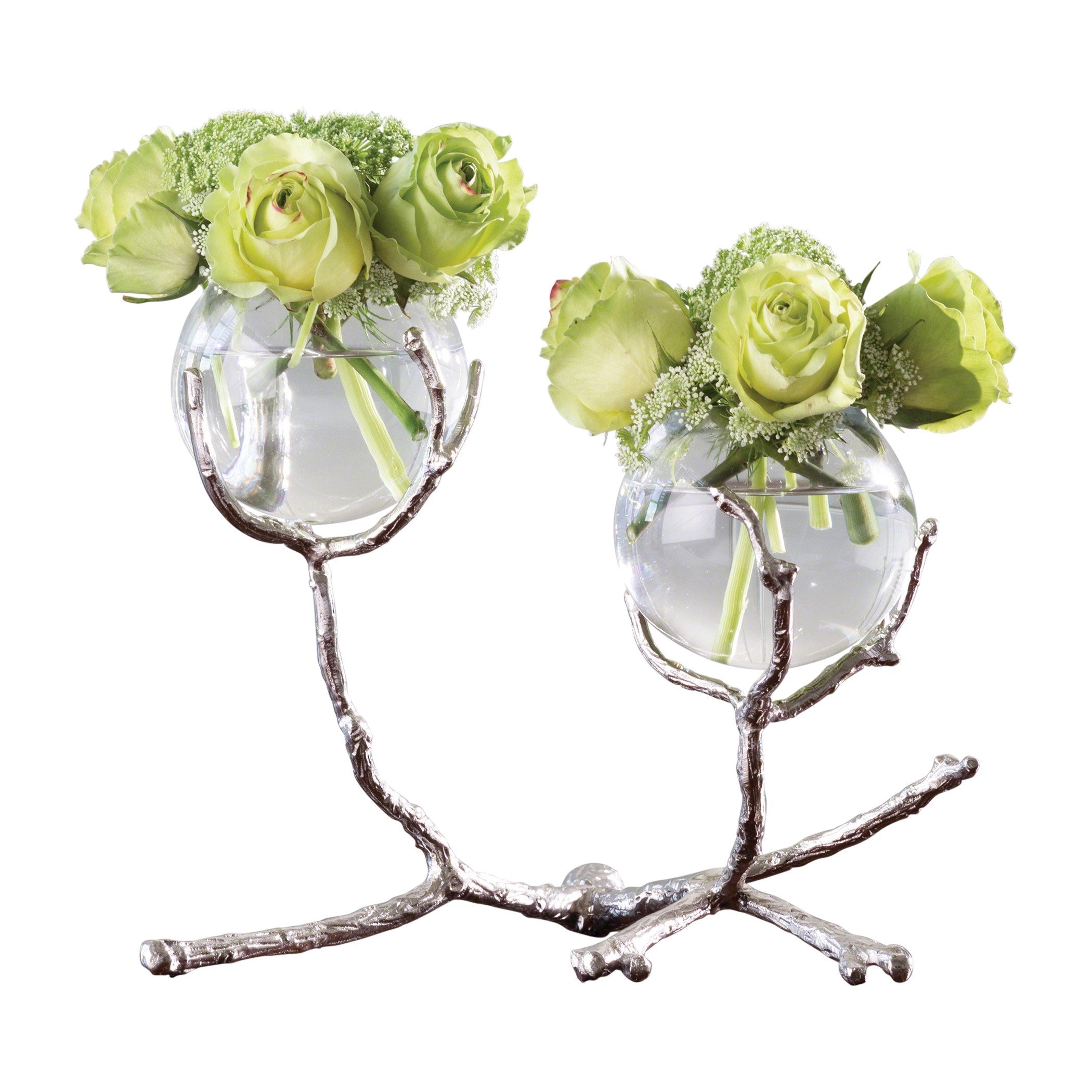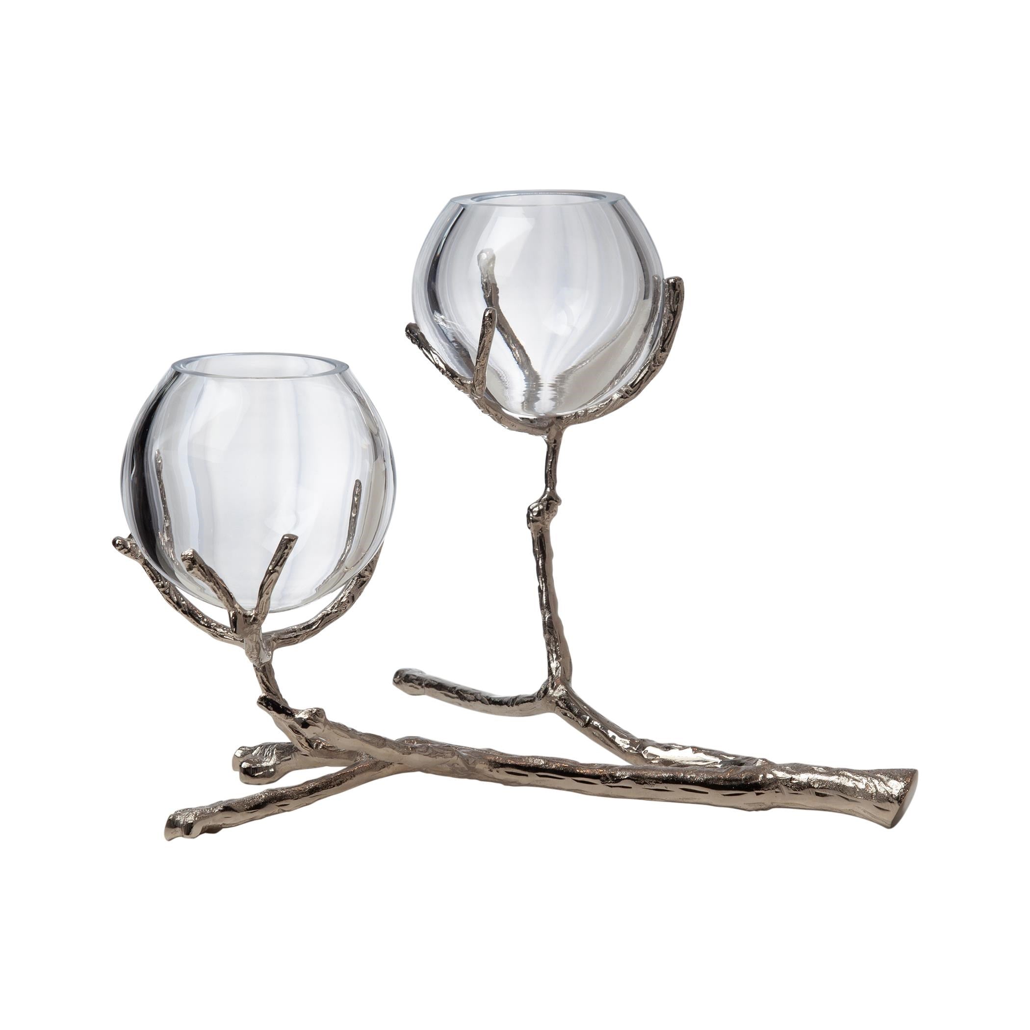 Stems of solid sand-cast brass twist and turn creating our Twig Vase Holders. These delicate vase holders have taken natural elements and turned them into glowing artful accessories. The glass bulb-shaped vases display small buds beautifully. Display one piece for a simple look or show all three sizes together for a dramatic tablescape. Available in three sizes: Large 3-vase holder, Medium 2-vase holder, and Small 1-vase holder. Also available in Brass.