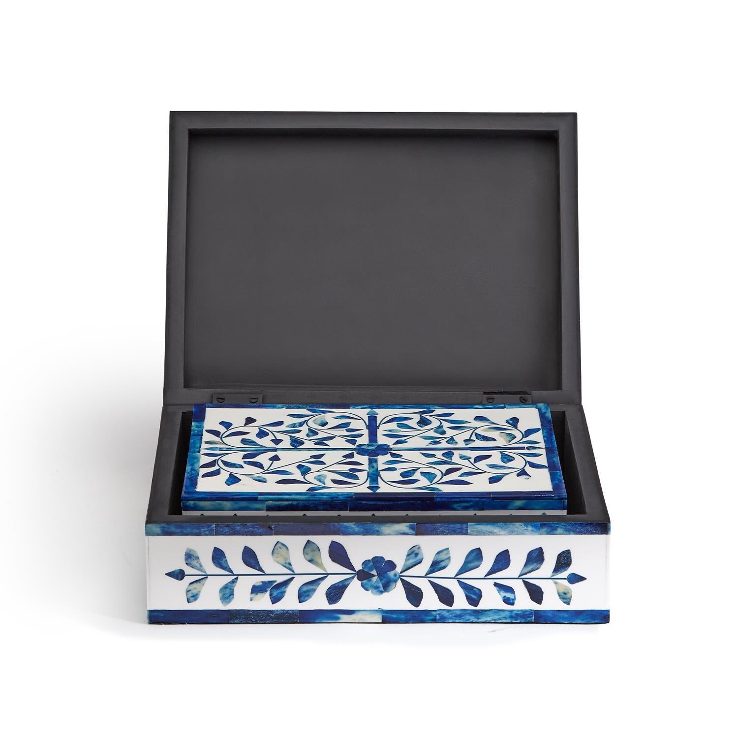 This blue and white set of 2 boxes is carefully crafted using bone and resin. Each petal is artfully placed to create an arrangement that flows so perfectly around. Each box is hinged for easy access.