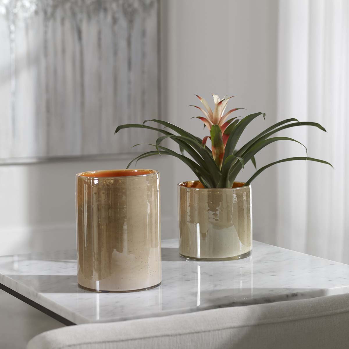 Handcrafted From Glass, These Vases Showcase An Iridescent Bubbled Exterior Finish In Light Beige With A Punch Of Vibrant Orange Inside. Sizes: S-6x6x6, L-6x8x6