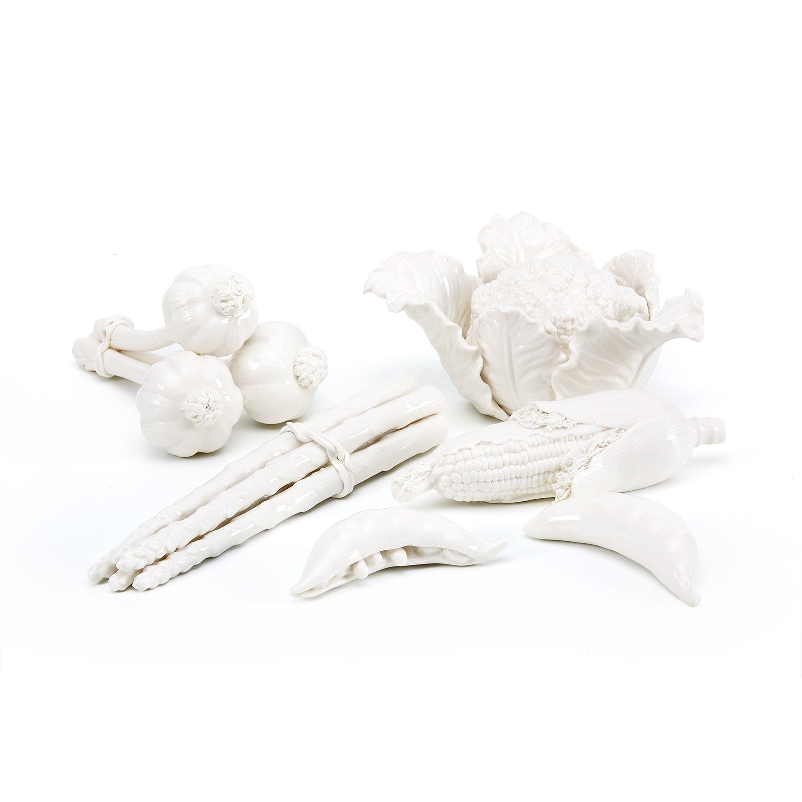 Giving new meaning to the phrase “farm-to-table,” our Vegetable Garden Set consists of produce you’ll definitely want to show off on your table and beyond. The tongue-in-cheek collection playfully depicts a range of farmstand vegetables in precious Blanc de Chine porcelain, turning everyday food items into stunning works of art. Villa & House’s artisans have approached these pieces with a sense of humor and an eye for detail. From the delicately tangled roots of the garlic bulbs to the crisply undulating leaves of the cauliflower, the realism is astounding. Inspired by a similar set spotted at an antique shop in Paris, these porcelain vegetables elevate any kitchen or dining area with a sense of French farmhouse charm. Display together as an island centerpiece or place them in different areas of a countertop as a fun decorative motif.11w x 6.5d x 5h