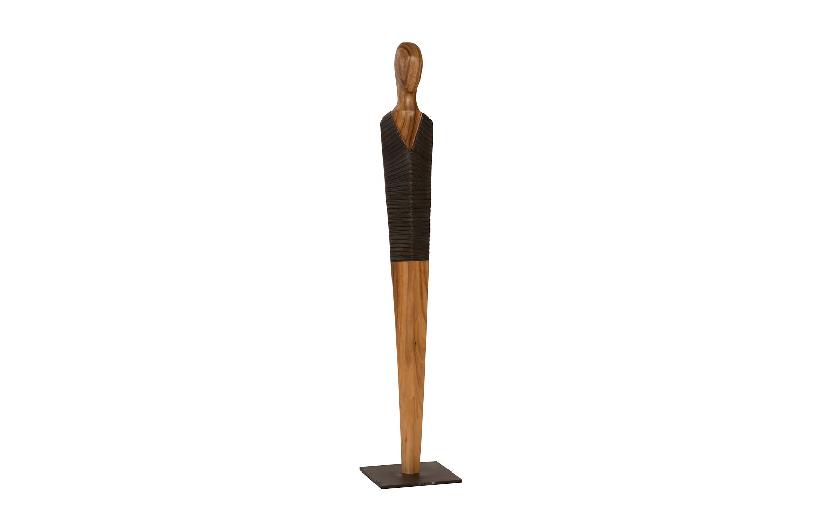 The human figure has been whittled down to its most minimal form to bring the Medium Vested Male Sculpture a contemporary cleanness. Extending from a minimalist metal base, the brown and black sculpture is carved from solid chamcha wood that has been painted and treated to a textured etching. There are several sizes of this wood sculpture and we also offer a female version. Each of these are serene and charming sculptural accents for any space, which makes them a perfect fit for Phillips Collection's modern organic ethos.