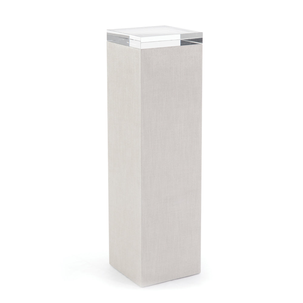 A simple square pedestal wrapped in linen with a light wash finish is paired with a crystal glass top.