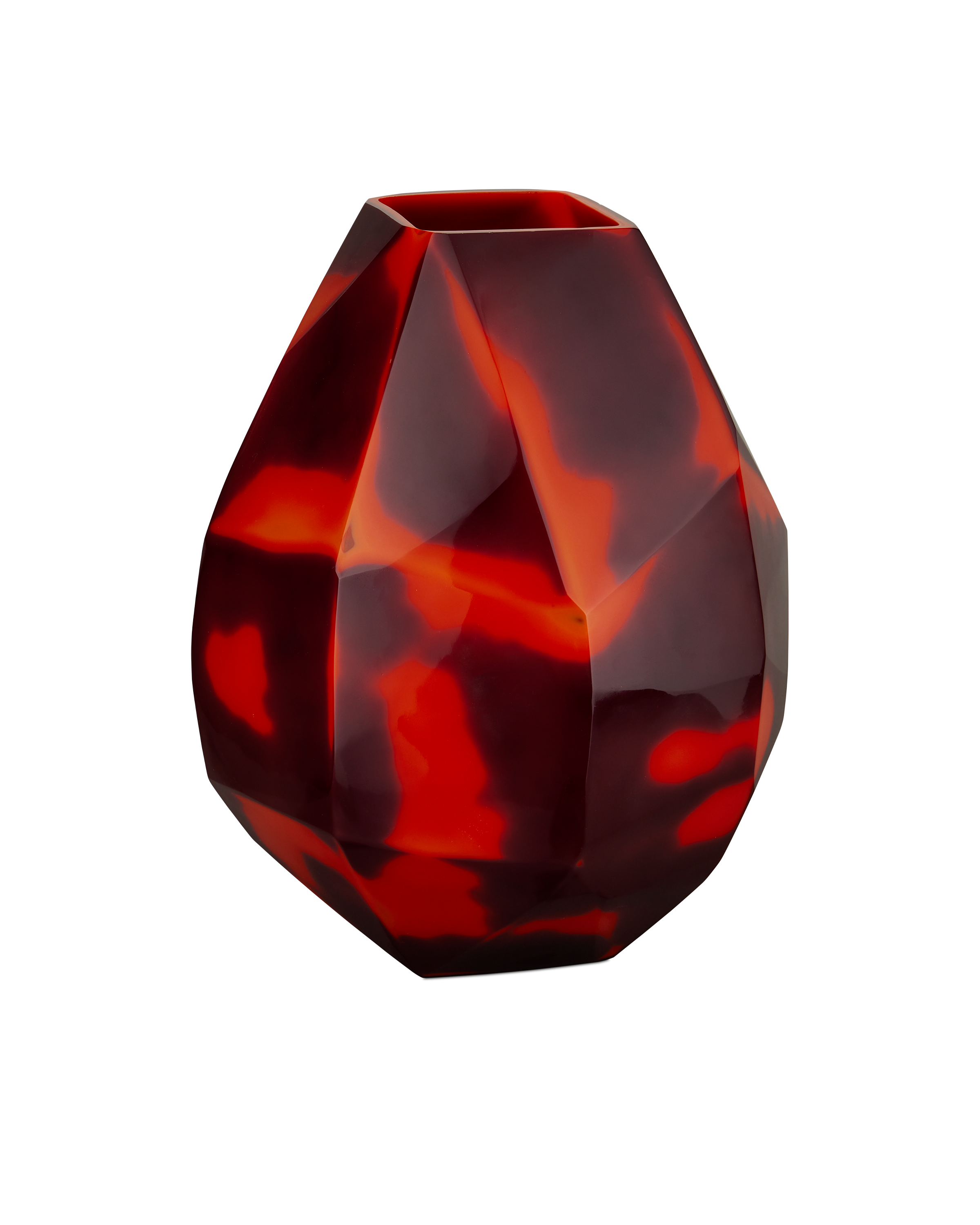 Like a cut diamond with a faceted form, the Akako Vase is a large mouth-blown glass vase with an angular profile. The vivid coral against the deeper color on its surface will make it a statement piece in an interior because it cannot help but glow. The red vase is quite large, so it is perfect for placing in a spot where it will dominate the vignette.