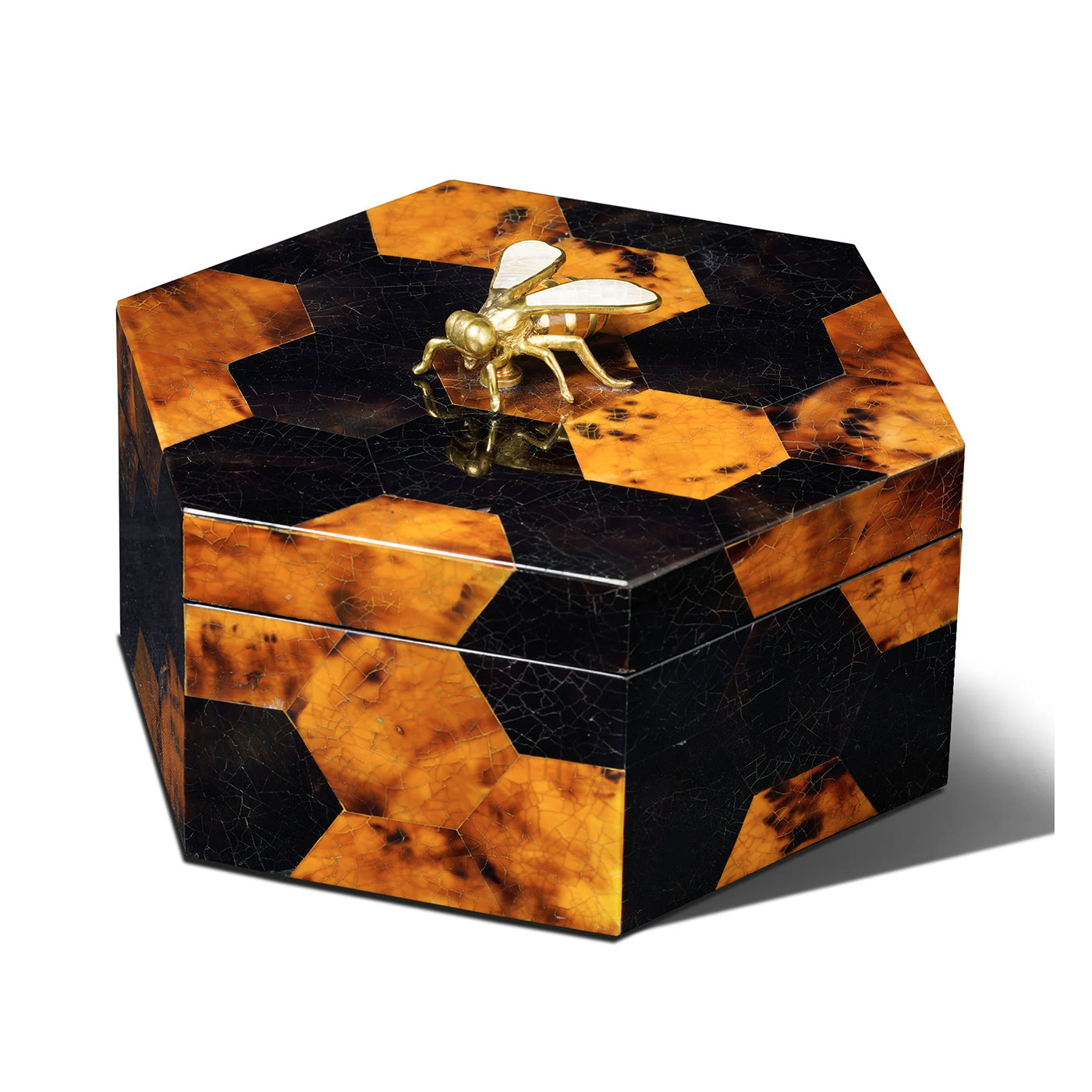 Hexagonal honeycomb shaped Crackled Black and Tiger Penshell inlaid box with Mother of Pearl inlaid Brass bee handle.