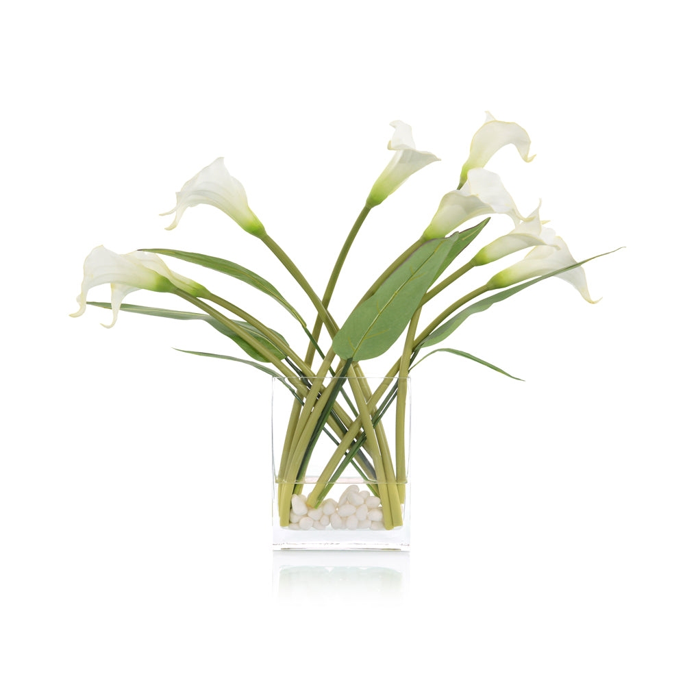 Windblown Callas are in a clear and slender vase with white rolled marble and faux water.