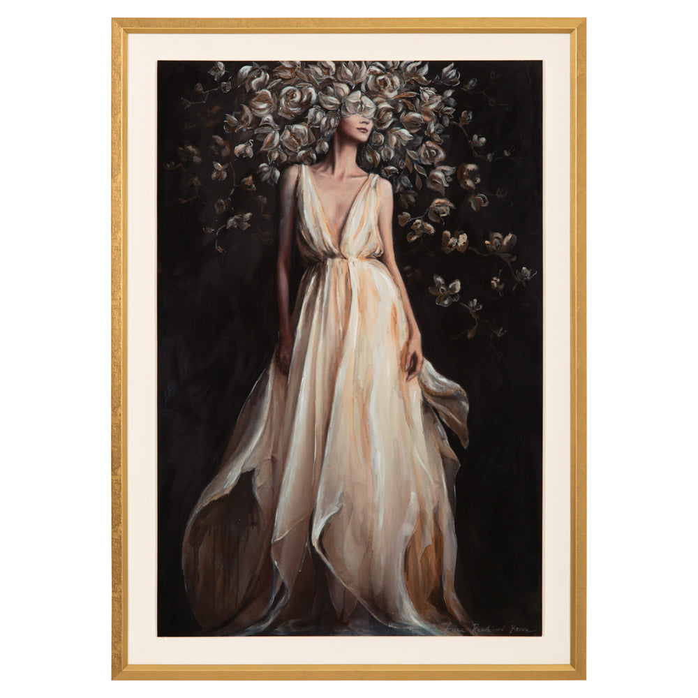 Blush and grey tones are striking atop the ebony background. This stunning work from artist Zana Brown is displayed under glass and surrounded by a gold molding.