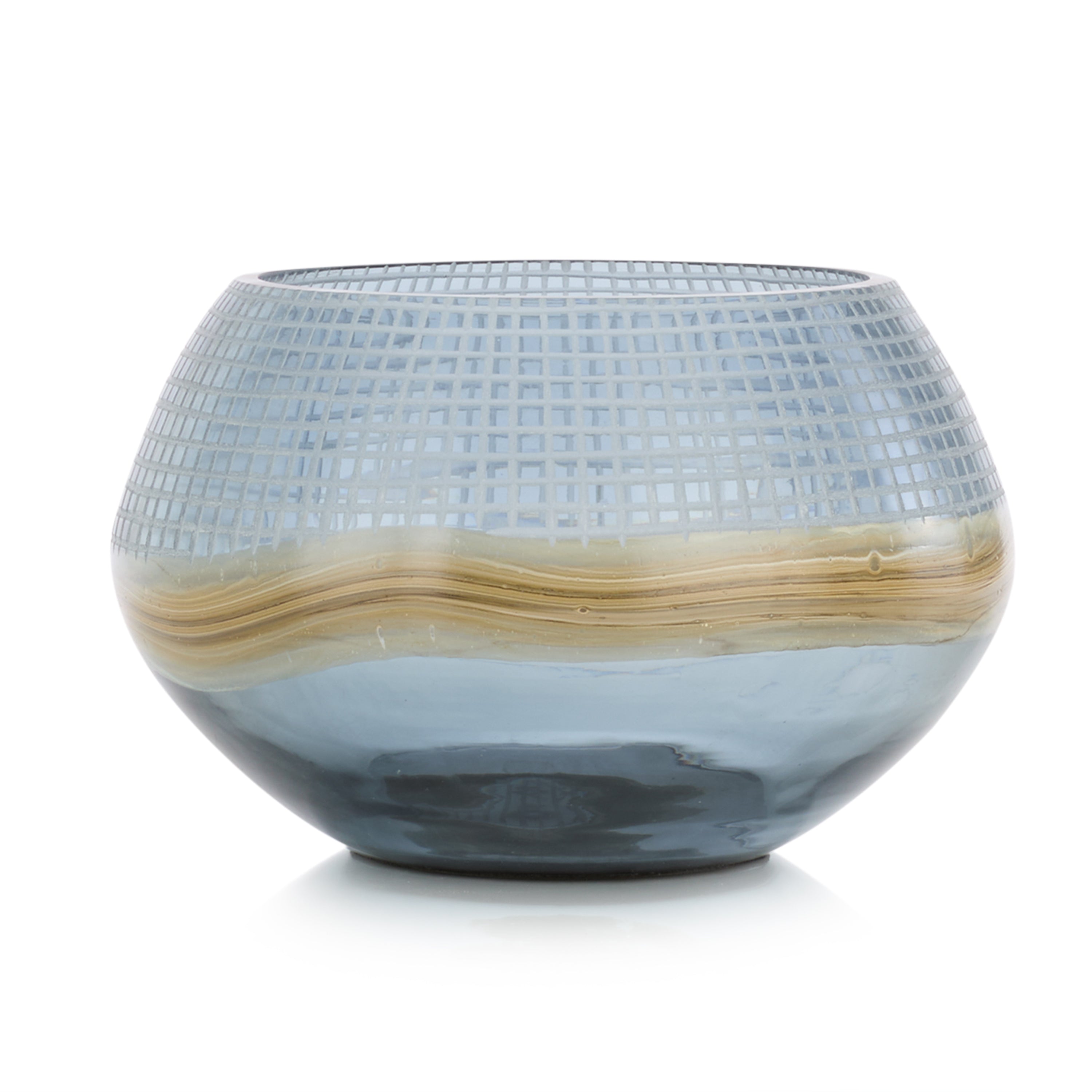 The Archipelago Bowl blends contemporary forms with stunning natural motifs. The vase is hand-crafted from art glass, featuring dark blue tones and a dimensional lattice texture. The bottom showcases organic forms, punctuated by a radiant gold streak that wraps around the piece.