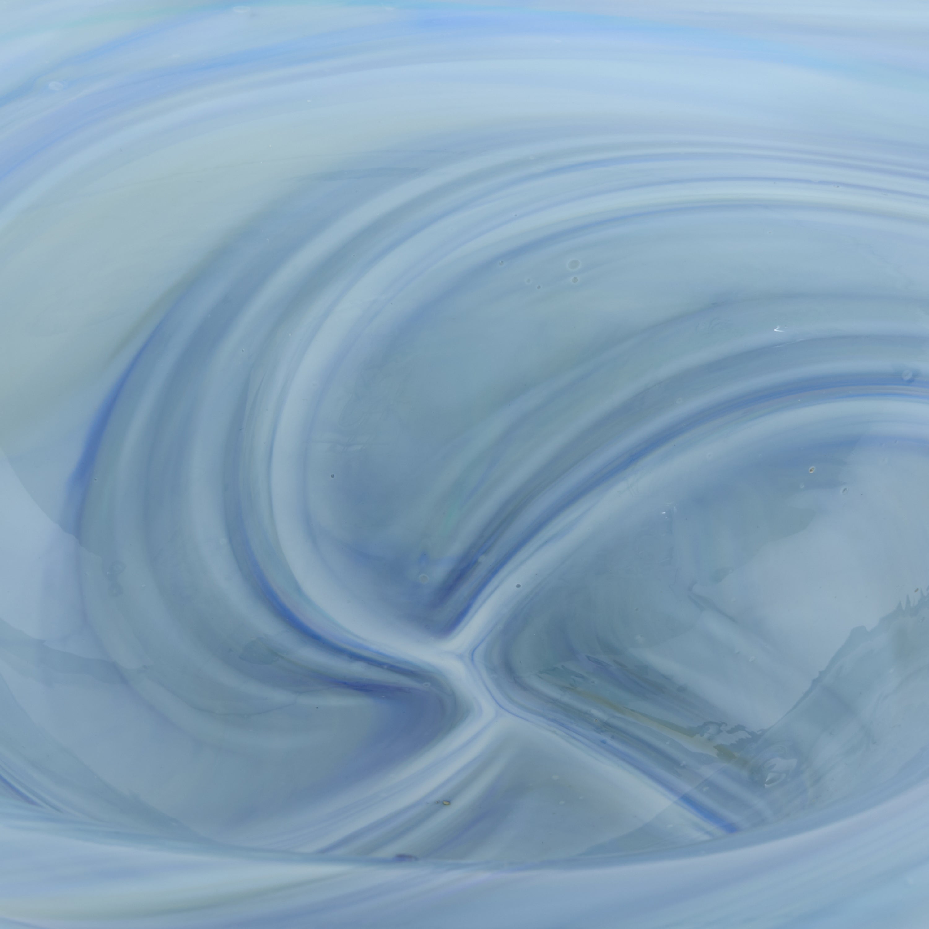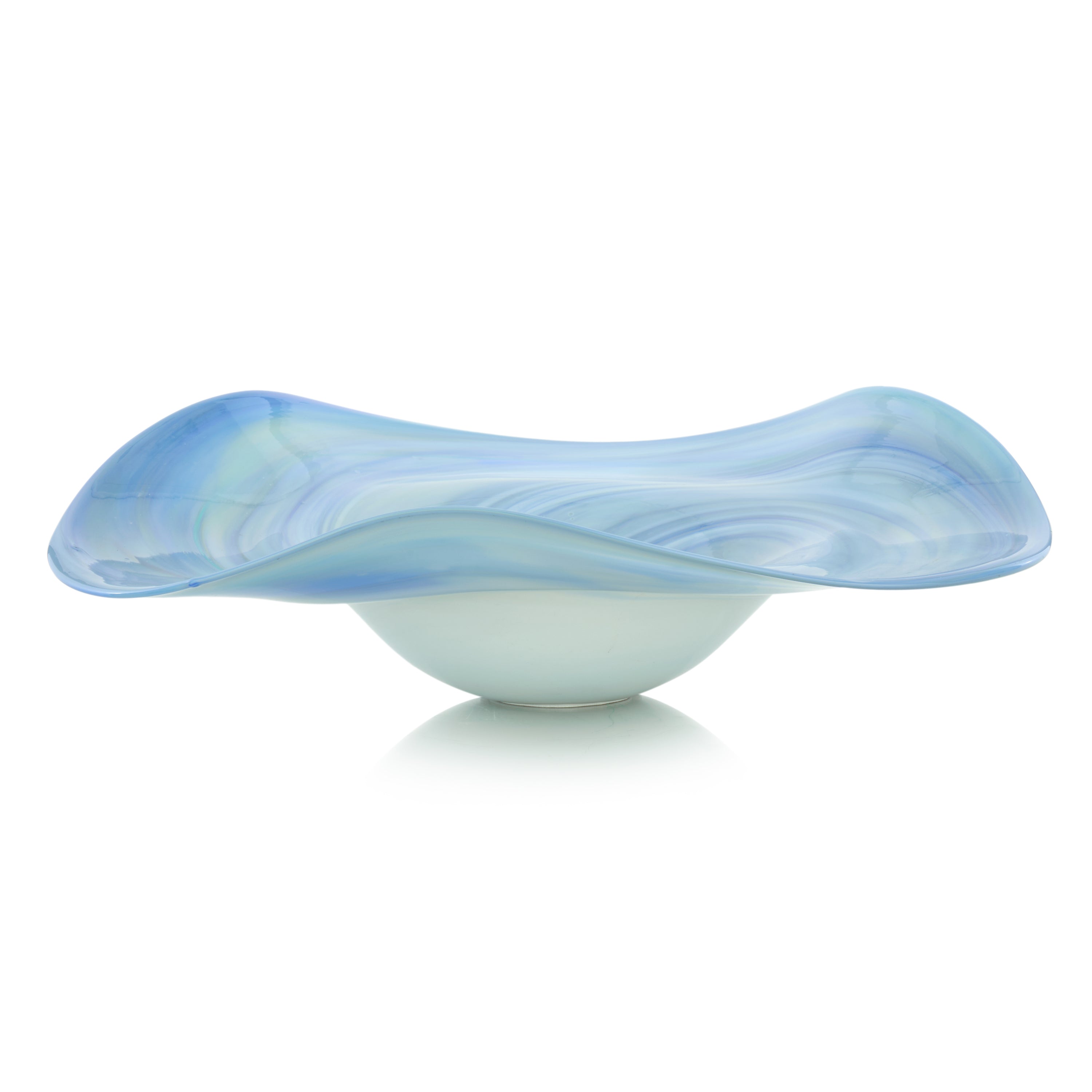 The Strato Bowl is a captivating design that captures the tranquil essence of a cloudy blue sky. Hand-blown from art glass, it features a rounded, abstract form with vivid blues and soft, wispy whites.