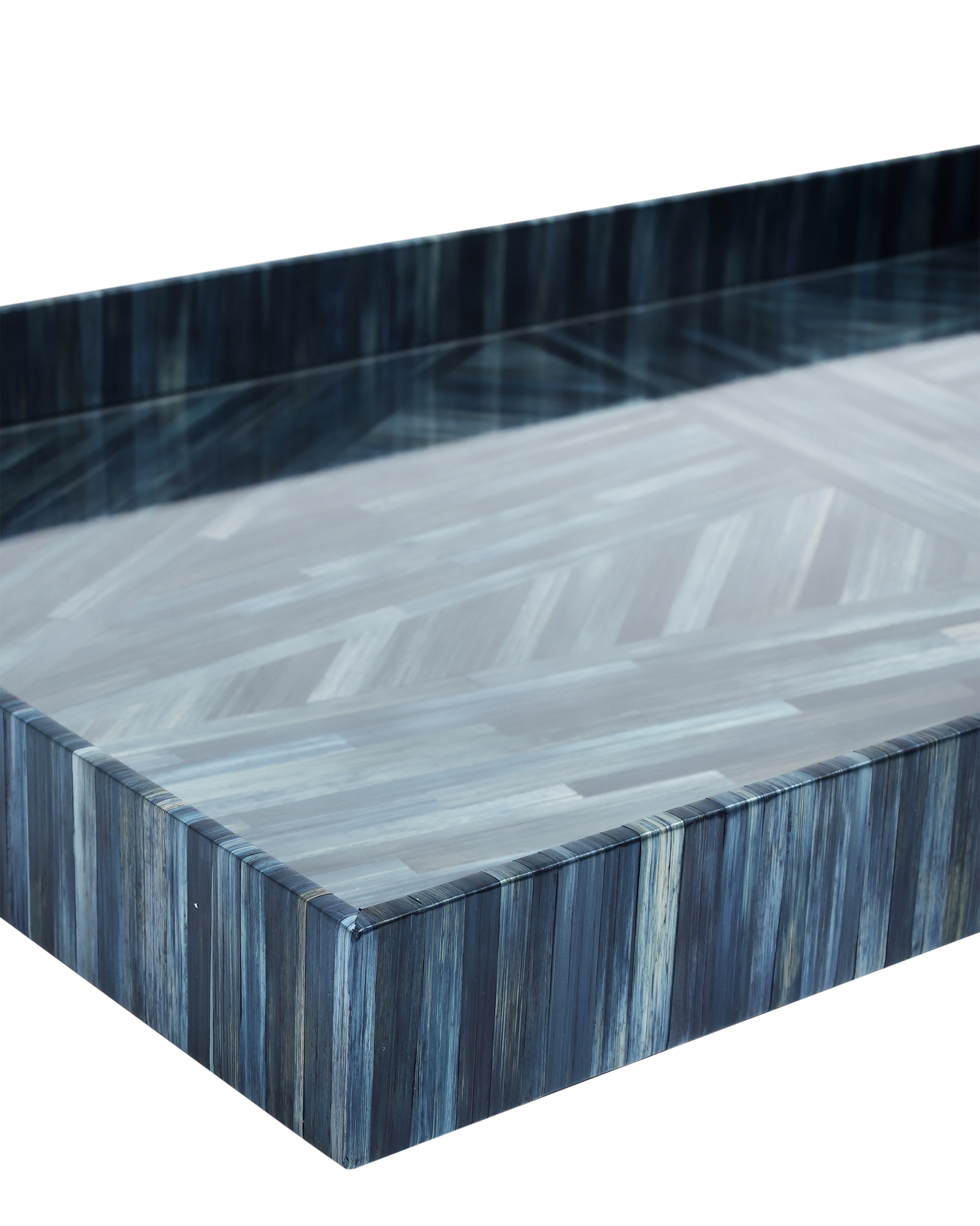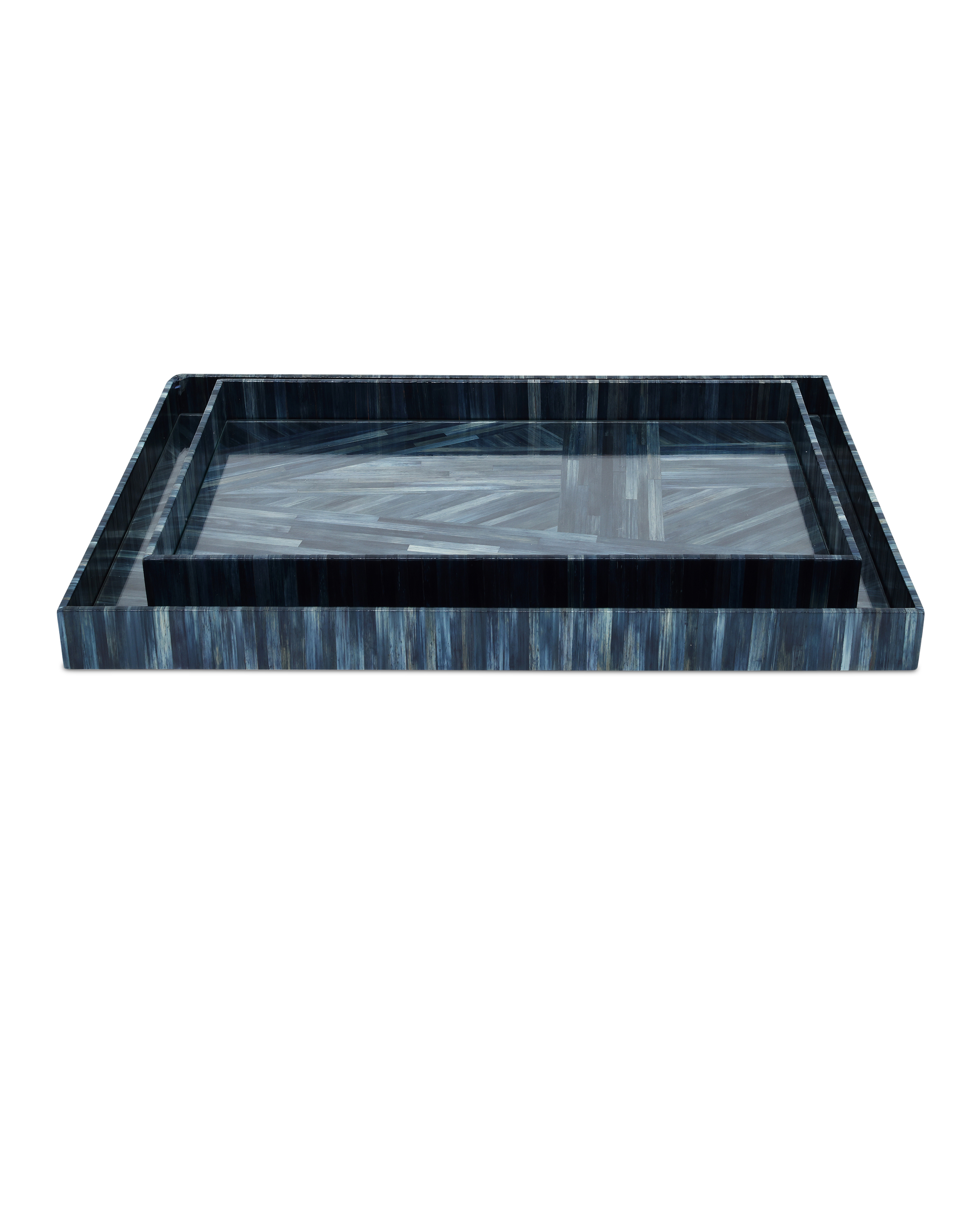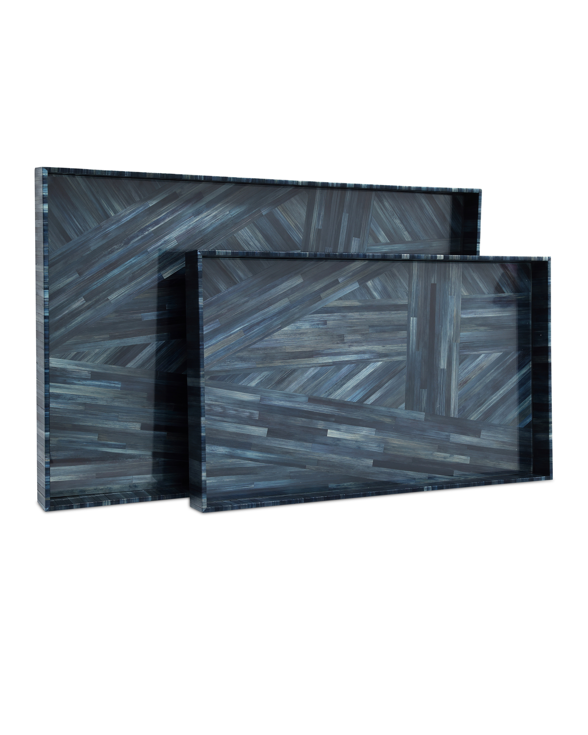The Currey & Company Winter Harvest Tray Set is two bright blue decorative trays made of wood and covered in hand-dyed straw.