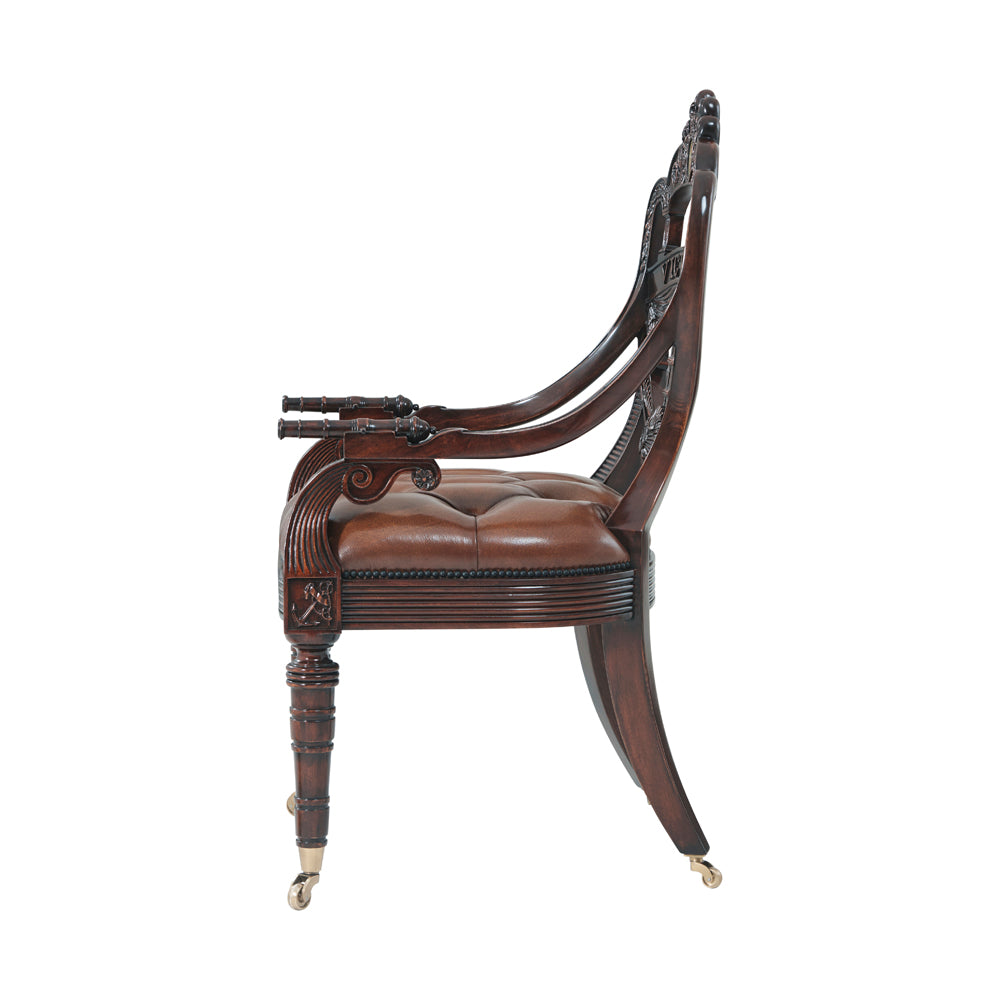 An exceptionally well hand carved mahogany library armchair, the back in the shape of a ship's transom carved with a Coat of Arms centred by the Spencer crest and flanked by Victory wreaths. Inspired by a Regency original.