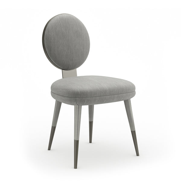 A contemporary take on neoclassical styling, this round back dining chair adds welcoming warmth and a note of tonal glamour. Meticulously tailored in a metallic dark grey woven fabric, its metallic dark grey Smoldering Paint frame gives a nod to the Atomic Age with tapered legs and iconic metal ferrules in a Deep Bronze. This chair is perfectly pitched for comfortable seating from dining table to desk or bedroom vanity.