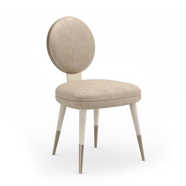 A contemporary take on neoclassical styling, this round back dining chair adds welcoming warmth and a note of tonal glamour. Meticulously tailored in a metallic light gold woven fabric, its Sparkling Argent paint frame gives a nod to the Atomic Age with tapered legs and iconic metal ferrules in a Deep Bronze. This chair is perfectly pitched for comfortable seating from dining table to desk or bedroom vanity.