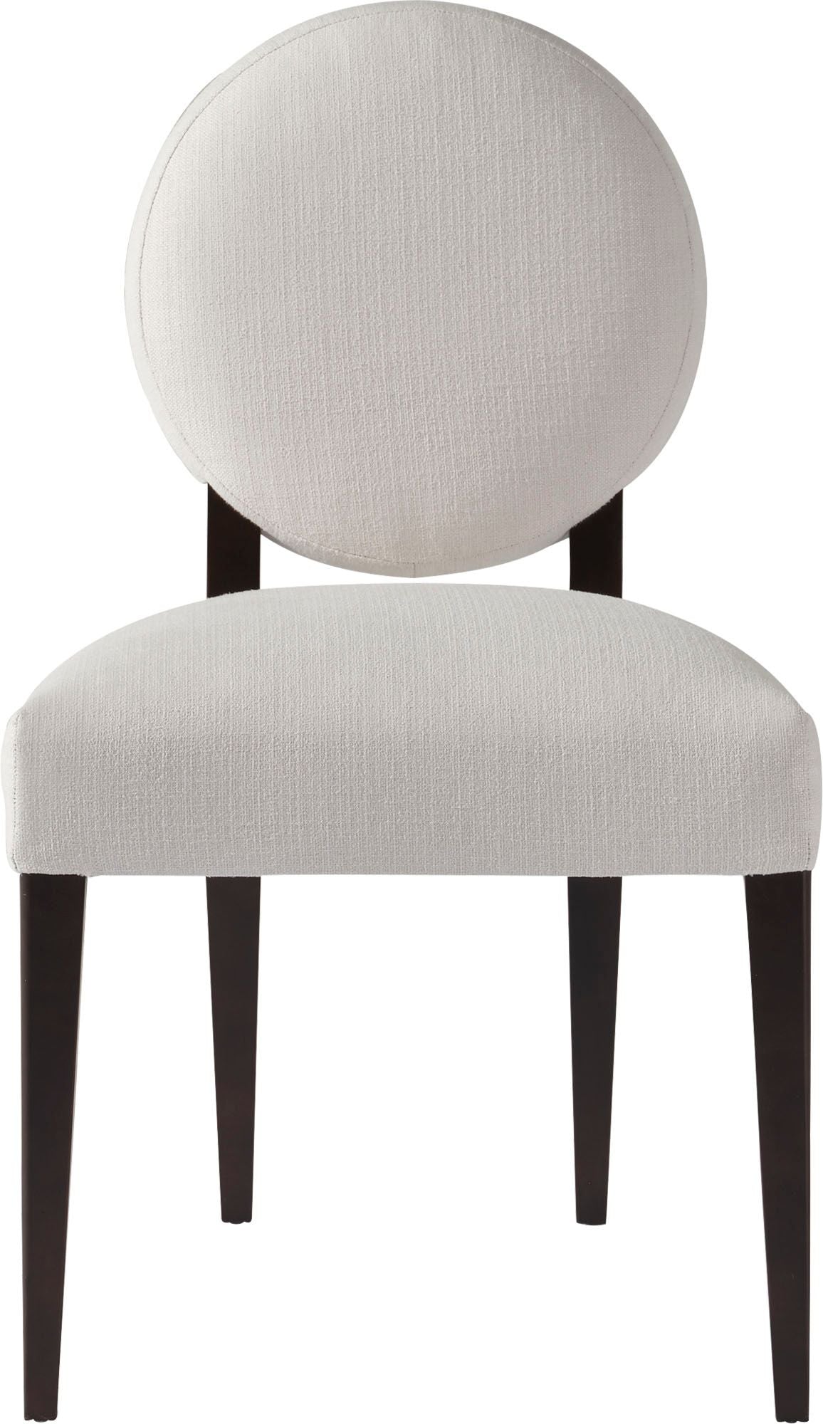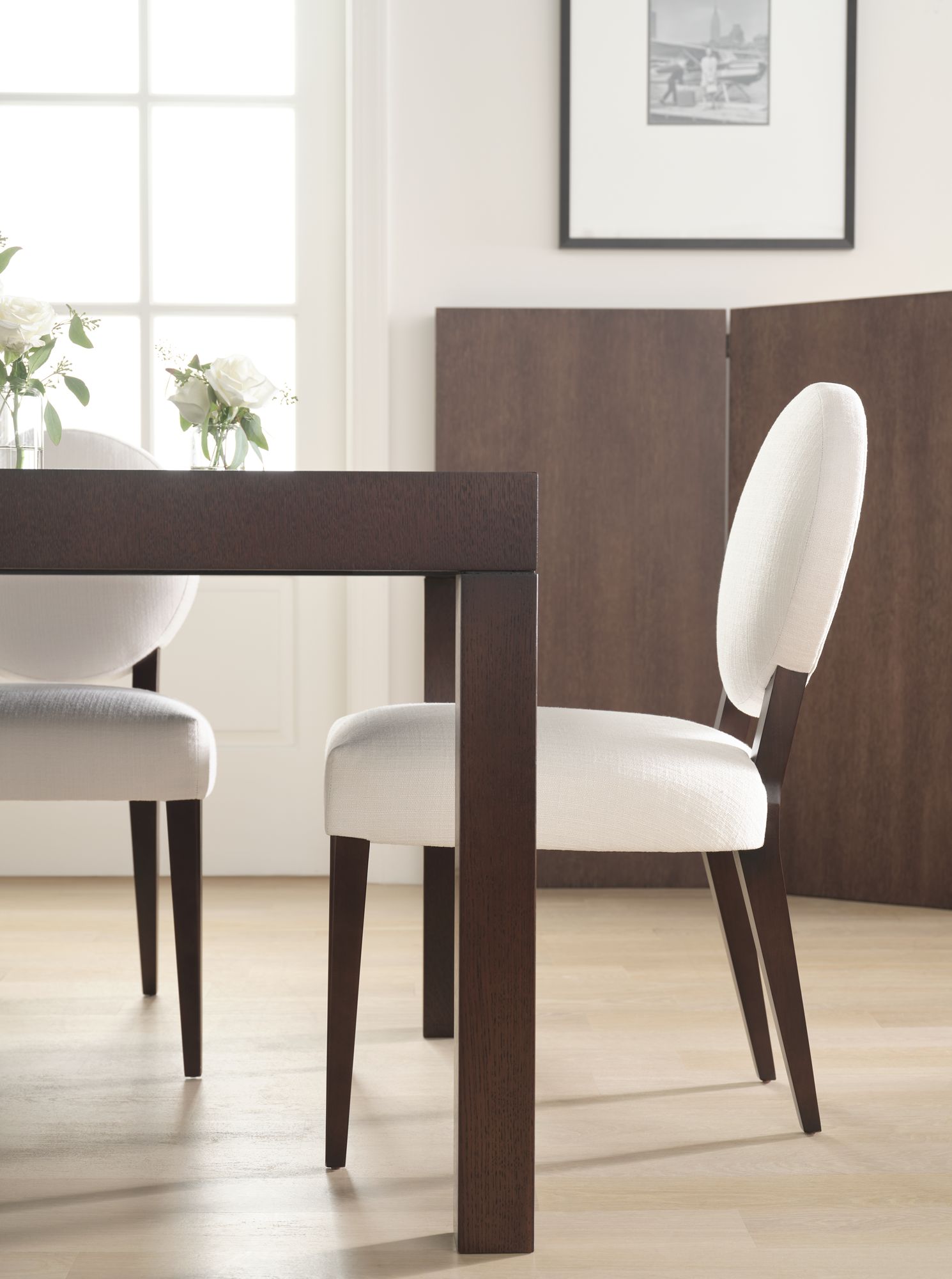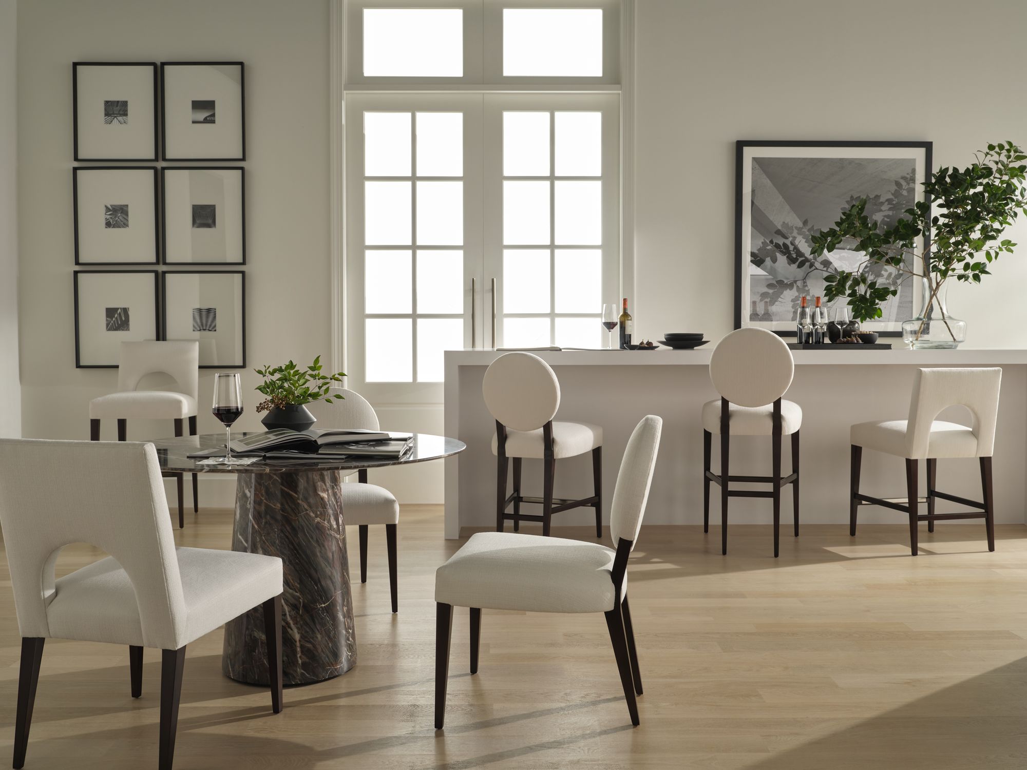 The Ashby Chair is a modernized take on a traditional, round-back chair, with the legs passing through the seat to give the back a floating appearance. This piece is fully upholstered for a comfortable, luxurious experience that lasts.