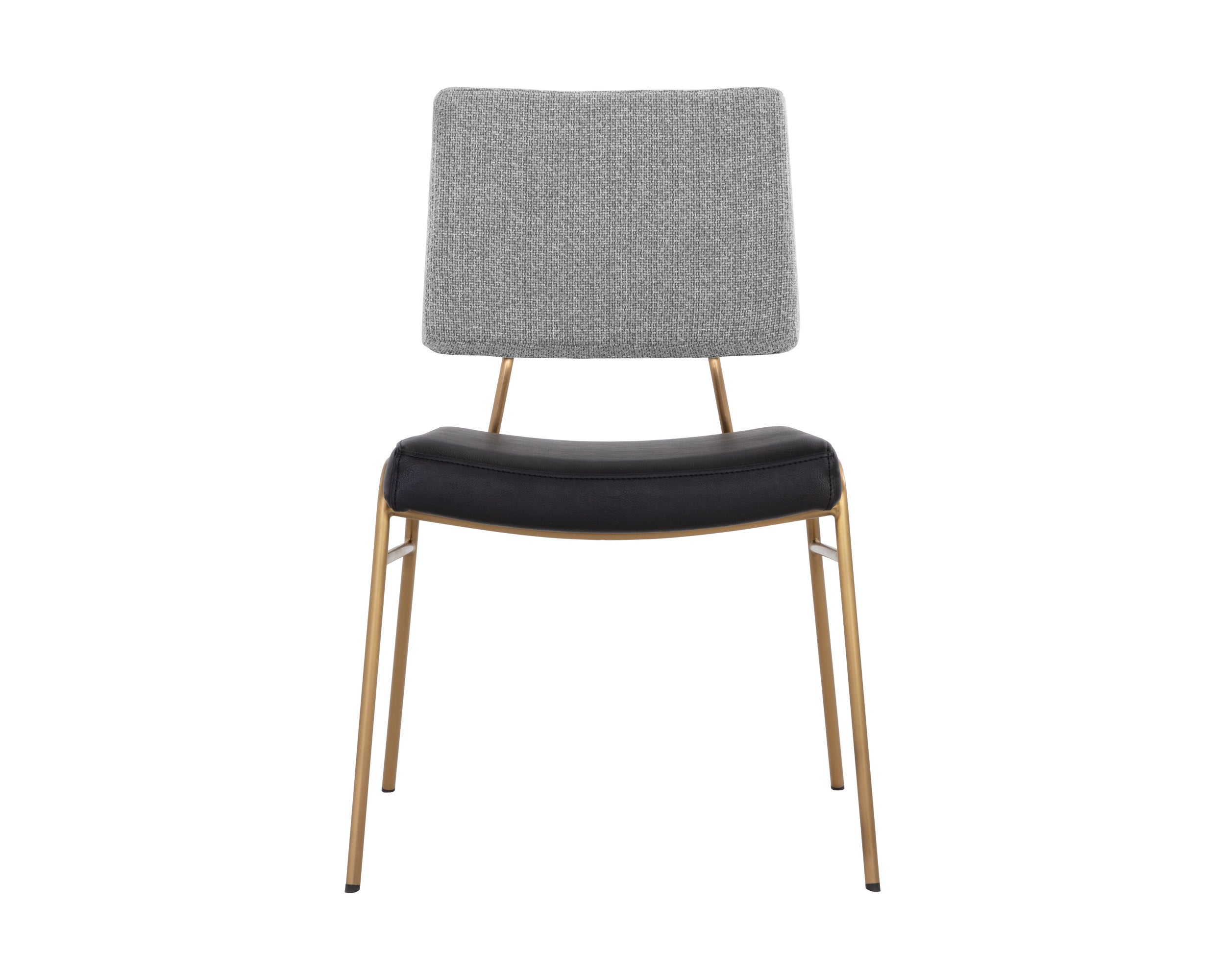 Contrasting materials bring this modern dining chair to life. The seatback is stocked in chacha grey fabric, while the seat is upholstered with nightfall black faux leather. Finished with gold stainless steel legs. Handle With Care: This design has been crafted with faux leather. Faux leather is manufactured to reflect the natural characteristics of leather; as such, colour variations, markings wrinkles, grooves, and light scratches are appreciated characteristics. No two pieces will be alike. Visit our Product Care page for more information on how to ensure the lasting beauty of this piece.