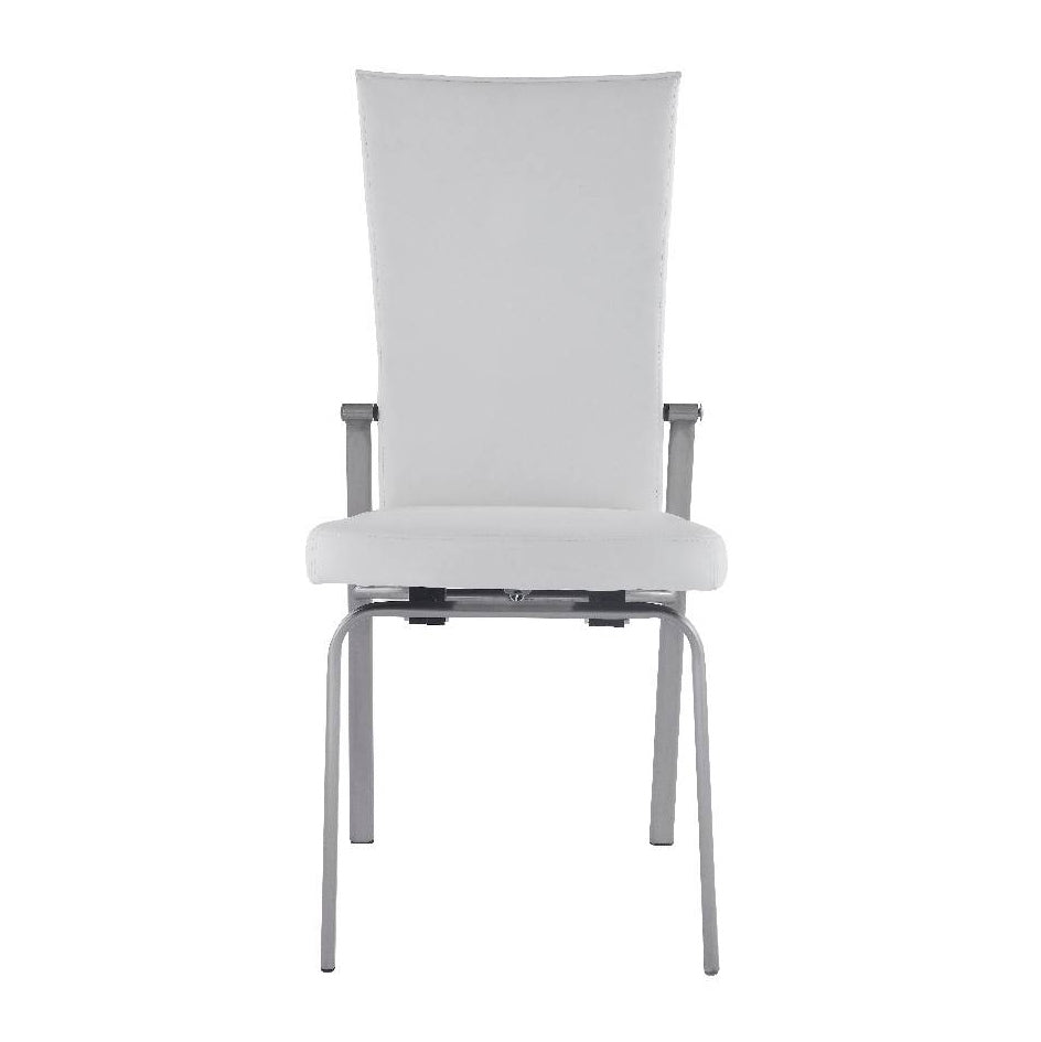 Enjoy this contemporary style chair in any setting. This chair comes ready to use right out of the box. Covered in white leather upholstery, this chair has a fashionable accent zipper on the backrest for a sleek look, also featuring motion functionality on the back for increased relaxation, set on a brushed stainless steel 4-legged base.