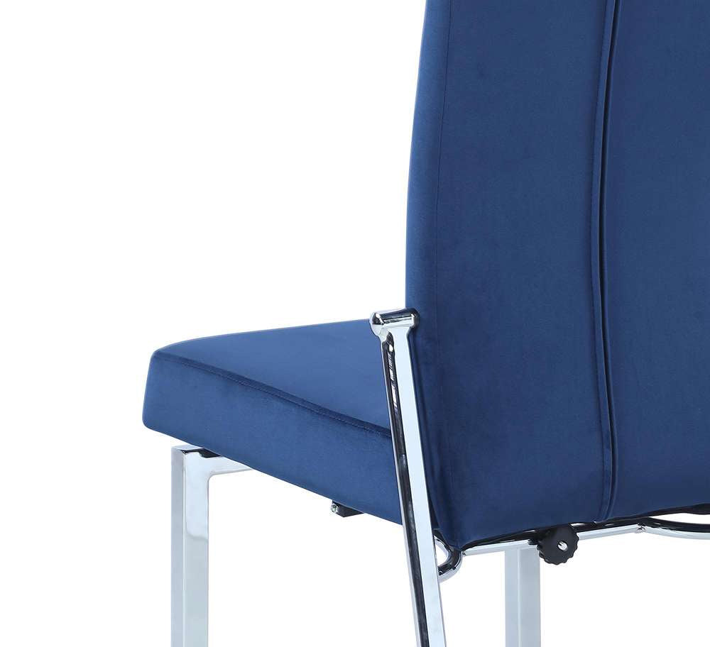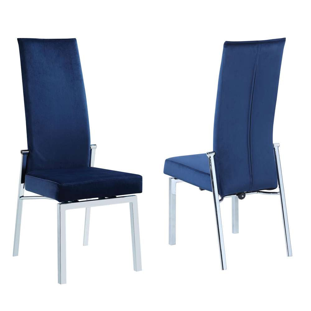 This tall-back side chair is draped on the seat and back with blue velvet, features reclinable motion tension adjustment, and is set on a chrome frame and legs. Add contemporary plush comfort to your dining area with our unique side chair.
