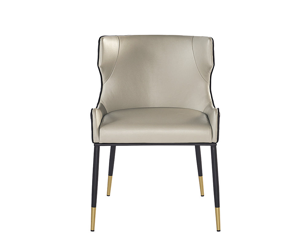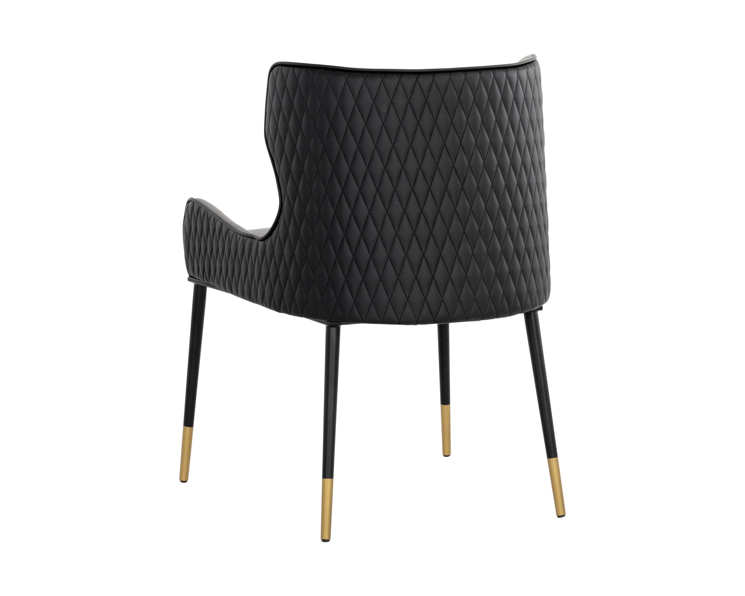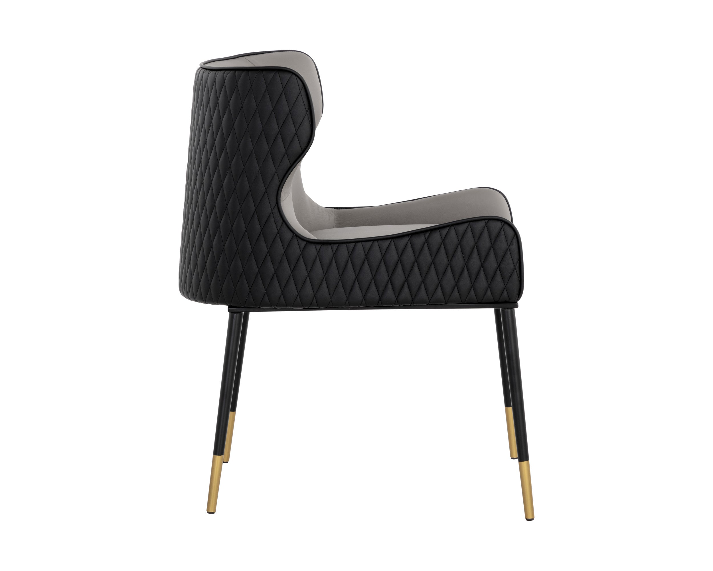 A classic dining chair featuring a substantial seat upholstered in contrasting dillon stratus and black faux leather. Diamond stitching on the seatback adds a hint of elegance while black wood legs and brushed gold foot caps complete the look. Handle With Care: This design has been crafted with faux leather. Faux leather is manufactured to reflect the natural characteristics of leather; as such, colour variations, markings, wrinkles, grooves, and light scratches are appreciated characteristics. No two pieces will be alike. Visit our Product Care page for more information on how to ensure the lasting beauty of this piece.