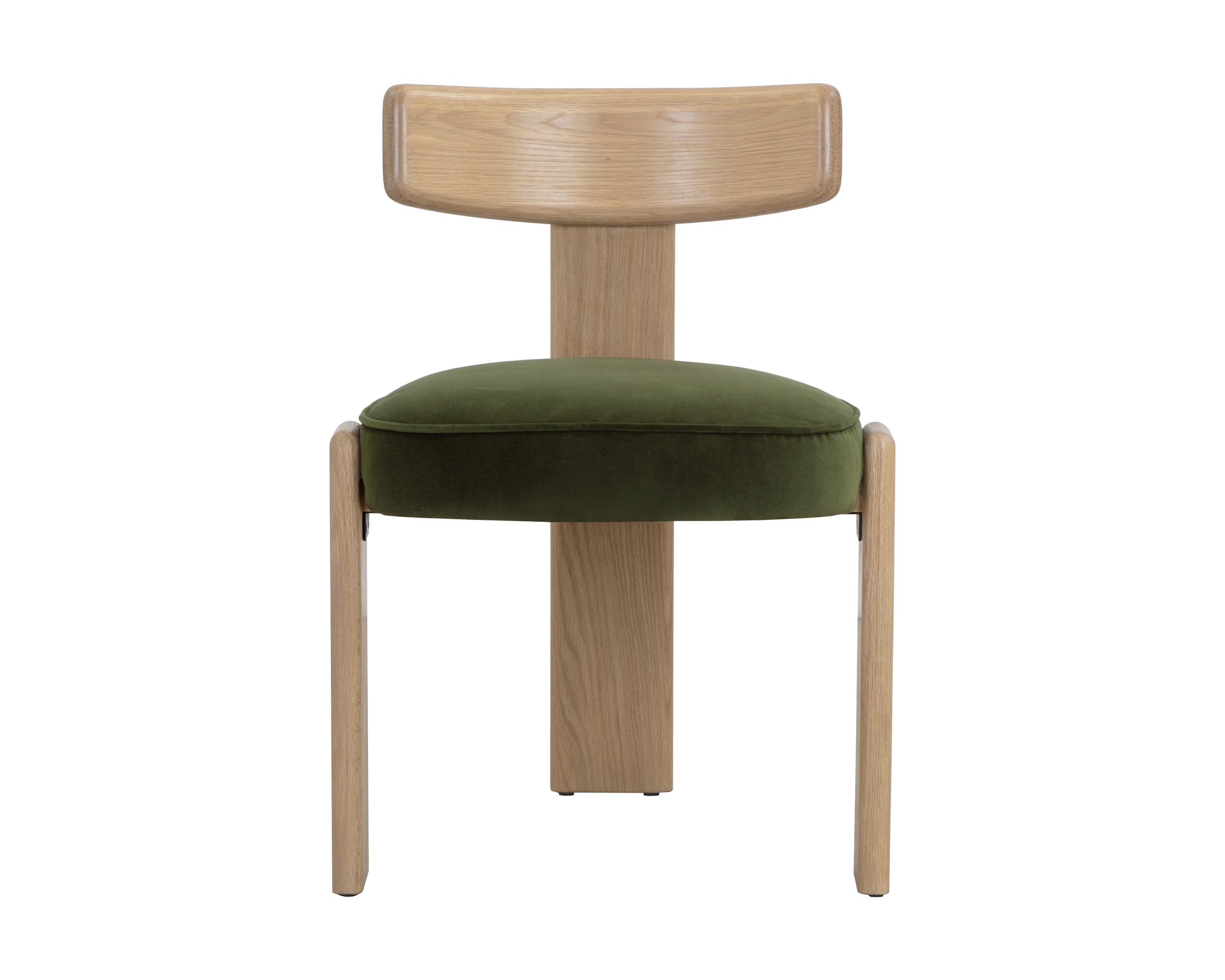 The Horton Dining Chair highlights the beauty of simplicity in contemporary design. A sculpted three-legged frame with a curved back constructed from rustic oak wood embraces the comfort of a beautiful seat upholstered in our forest green fabric. As wood is an organic, porous material, these pieces will contain natural variation of texture and may also exhibit fine indentations and cracks. Wood pieces will also display a disparity of colour and grain, and visible knots and burls that add to the character of each piece.