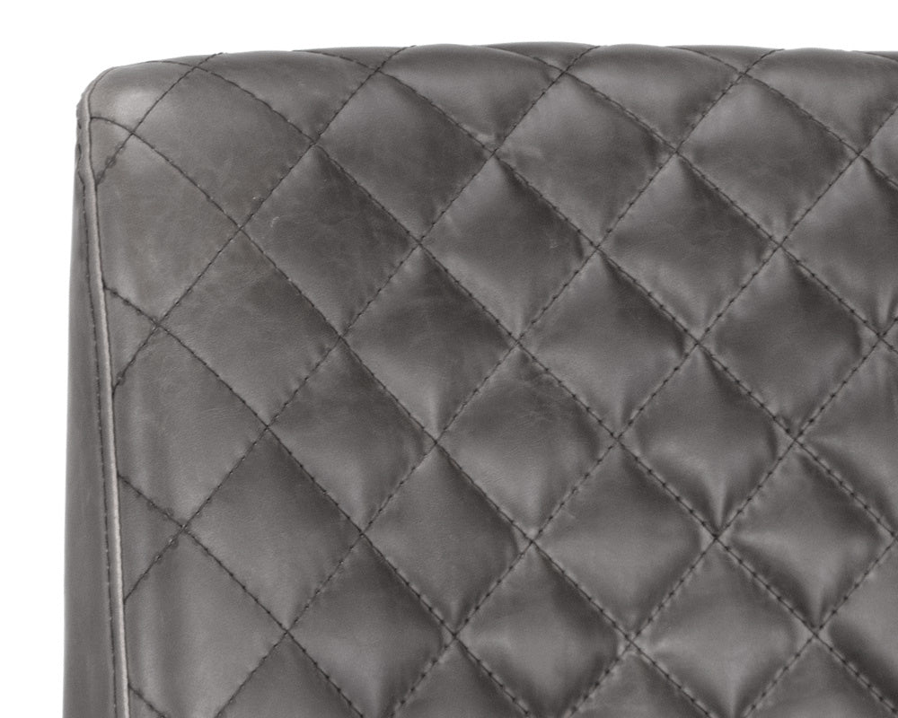 Invigorate dining spaces with this classic dining chair. Features beautiful diamond stitching on the interior seat back and an antique brass frame steel frame. Stocked in overcast grey faux leather. Handle With Care: This design has been crafted with faux leather. Faux leather is manufactured to reflect the natural characteristics of leather; as such, colour variations, markings, wrinkles, grooves, and light scratches are appreciated characteristics. No two pieces will be alike. Visit our Product Care page for more information on how to ensure the lasting beauty of this piece.