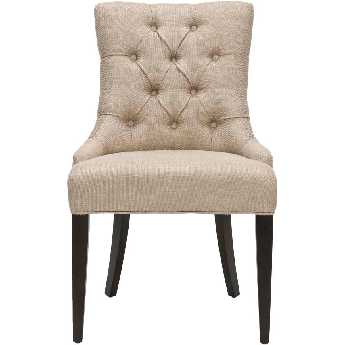A buttoned up elegance infuses the antique gold linen upholstered Amanda Chair with an espresso finish on the legs. A high back, curved rear legs and modest sloped arms produce a sophisticated profile at home in formal settings.