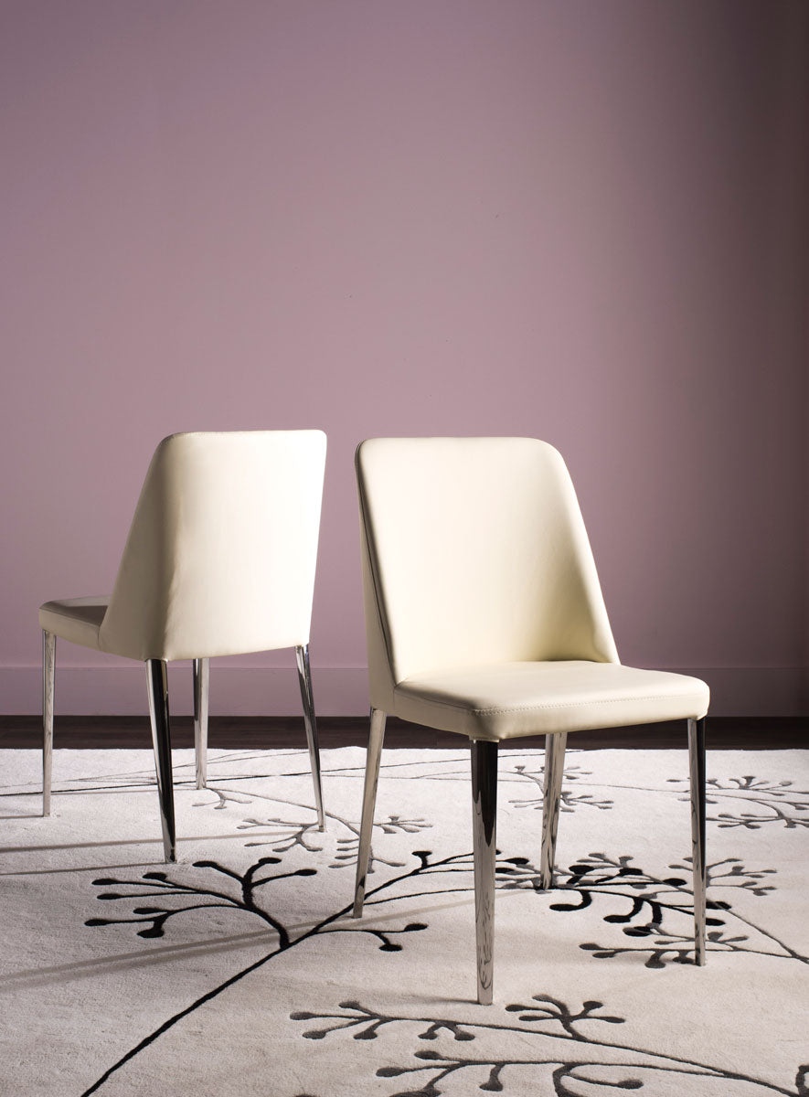 Indulge in comfort and style with this set of two modern side chairs in buttercream PU leather with polished stainless steel legs. Their contemporary design adds drama to kitchen or dining room with a low profile silhouette that visually expands a room.
