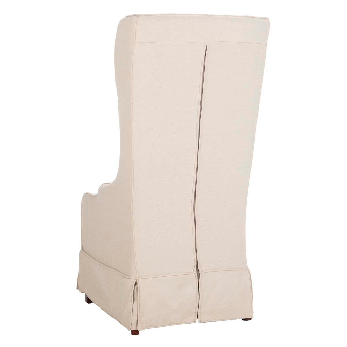 The Slipcover Bacall Dining Chair in a natural cream cotton blend with cherry mahogany finish commands attention in any space. With a reaching, slightly tapered backrest and sloping arms, the dramatic Bacall is all about smart sophistication and luxurious comfort.