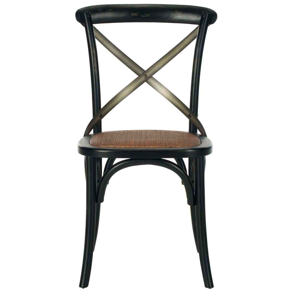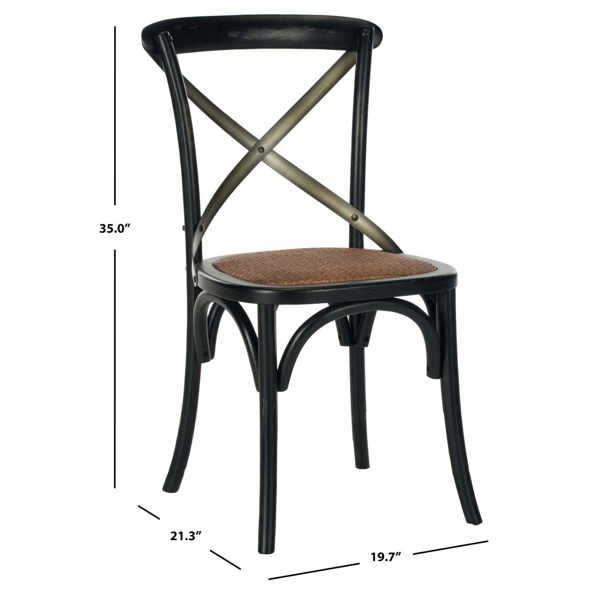 No chair is as famous as Thonet's bentwood cafe model, and Safavieh's Eleanor X Back side chair pays homage to the beloved original. Your kitchen or dining room will conjure images of Vienna's cafe society with Eleanor's bent metal frame in distressed hickory finish, rattan seat and authentic arch brace in black metal.