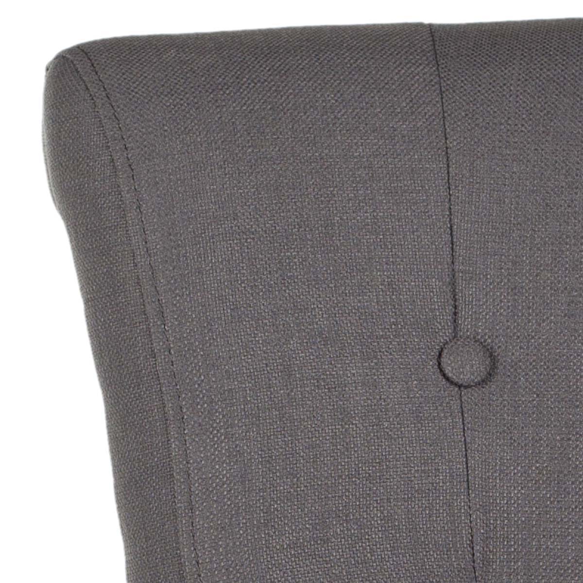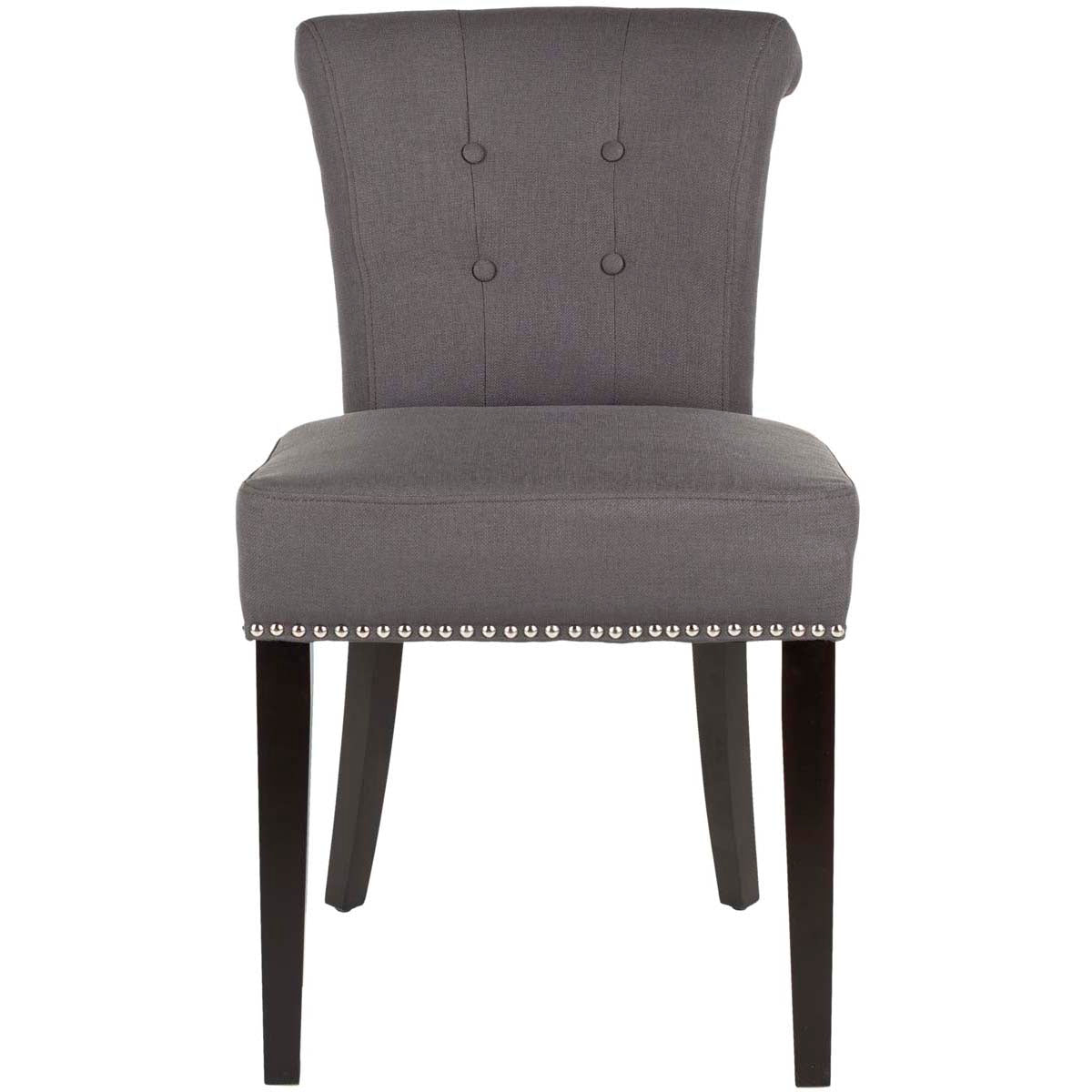 The bent back of the Sinclaire dining chair, in charcoal fabric with espresso finish on the legs, gets a classic dressed up punch thanks to exposed nail heads and cleaver metal ring on its back. Button tufts on the front of the tapered backrest and generous cushions make it a handsome seat.