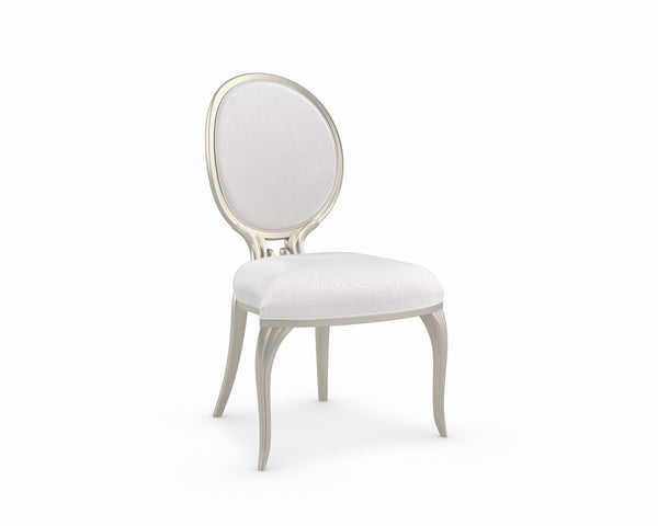 Forever-fashionable with an oval-shaped back, this side chair makes an elegant dining companion. Dressed to impress and ease entertaining, its plush seat and inside back are tailored in a shimmering performance hobnail satin. Features fluted front legs and back legs with a scroll detail for added embellishment.