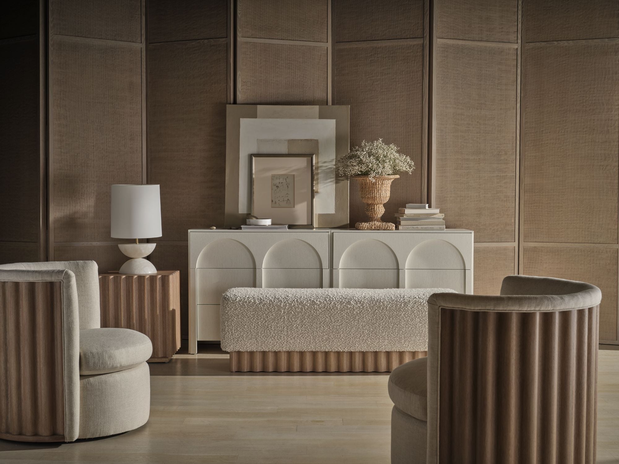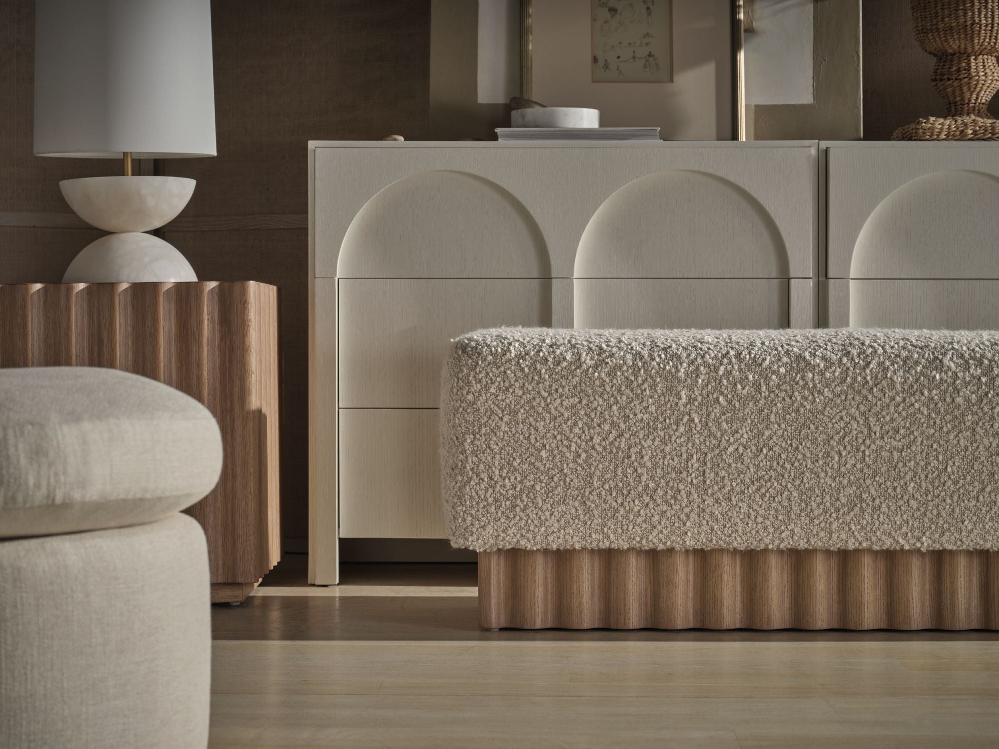With a base inspired by the unpredictable, undulating edges of seaside cliffs, the Aemilius Bench feels both organic and refined. It has a tightly upholstered top for a modernist look.